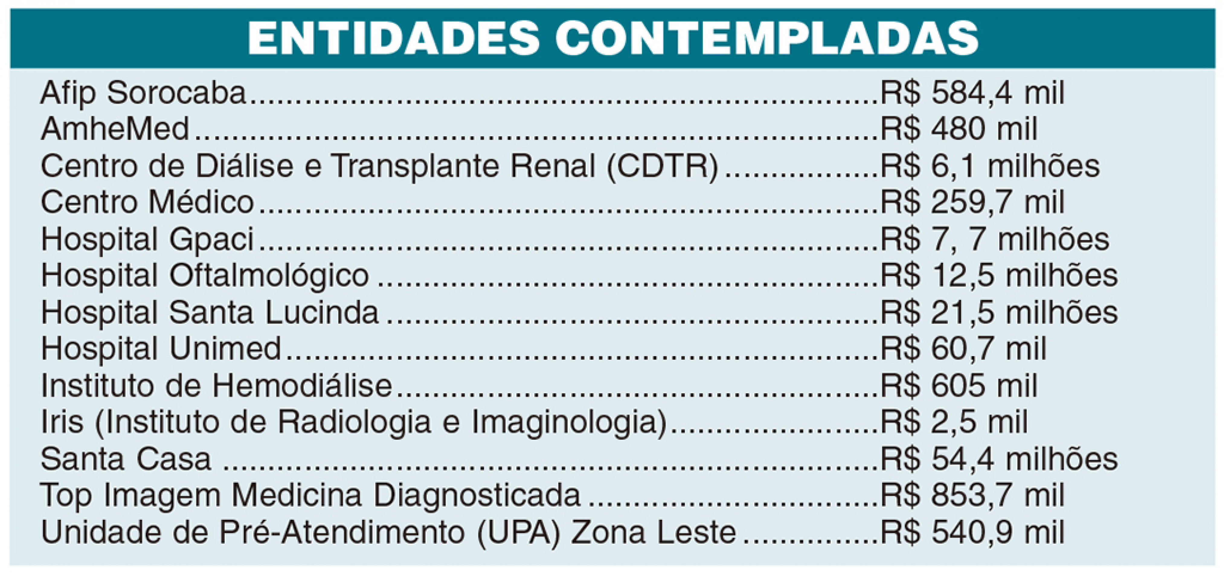 De acordo com o painel de informações do programa, 800 instituições filantrópicas são contempladas no Estado e 54 na região. Em Sorocaba, 13 unidades de saúde fazem parte da iniciativa. Juntas, elas receberam R$ 105,8 milhões. Em fevereiro, data da mais recente atualização do painel, foi pago um complemento de R$ 7,7 milhões.