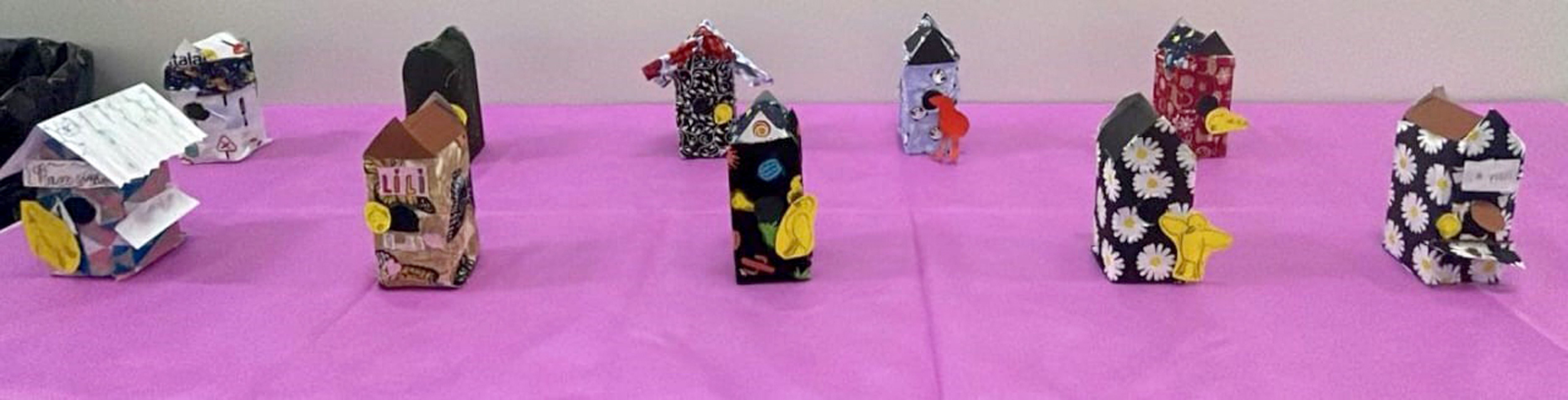 Durante o processo, as crianças cortaram as caixas com auxílio e supervisão, pintaram, colaram tecidos e elementos decorativos e criaram aberturas para simular a entrada dos passarinhos. Cada aluno pôde personalizar sua casinha com tintas, papéis coloridos, tampinhas e outros materiais recicláveis.