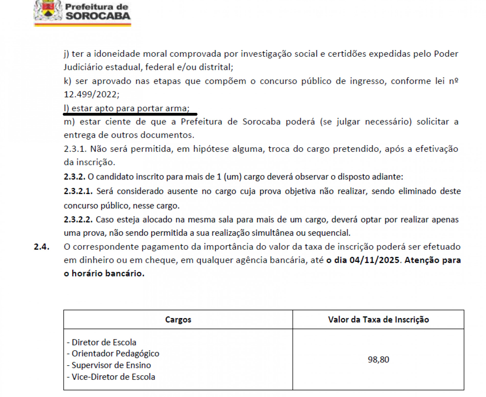 A Prefeitura de Sorocaba causou polêmica ao publicar um edital de abertura de concurso público para cargos da educação com a exigência de aptidão ao porte de arma. O documento foi divulgado na quarta-feira (10) no jornal do município. Entre as diversas condições, o edital também estabelece idade máxima de 35 anos até a data de término do período de inscrição, situação comum em concursos públicos para a Guarda Civil Municipal (GCM). A Prefeitura informou que cometeu um erro; o edital foi retificado nesta quinta-feira (11) no jornal do município.