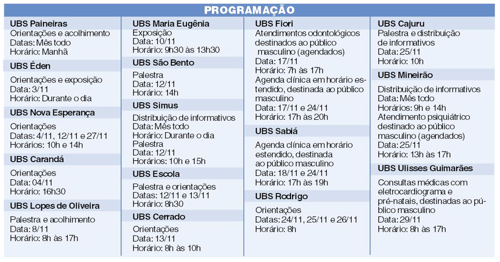 Várias UBSs espalhadas pela cidade receberão programação especial, com palestras, orientações, distribuição de informativos, exposições e acolhimento. Além disso, haverá atendimentos clínicos voltados ao público masculino, com necessidade prévia de agendamento. (Da Redação)