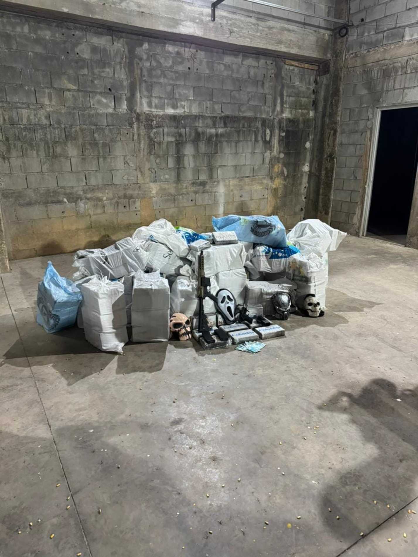 Dentro do galpão, os policiais localizaram uma carreta carregada com milho. No veículo e nas proximidades, foram encontrados 543 quilos de cocaína embalados em sacos.