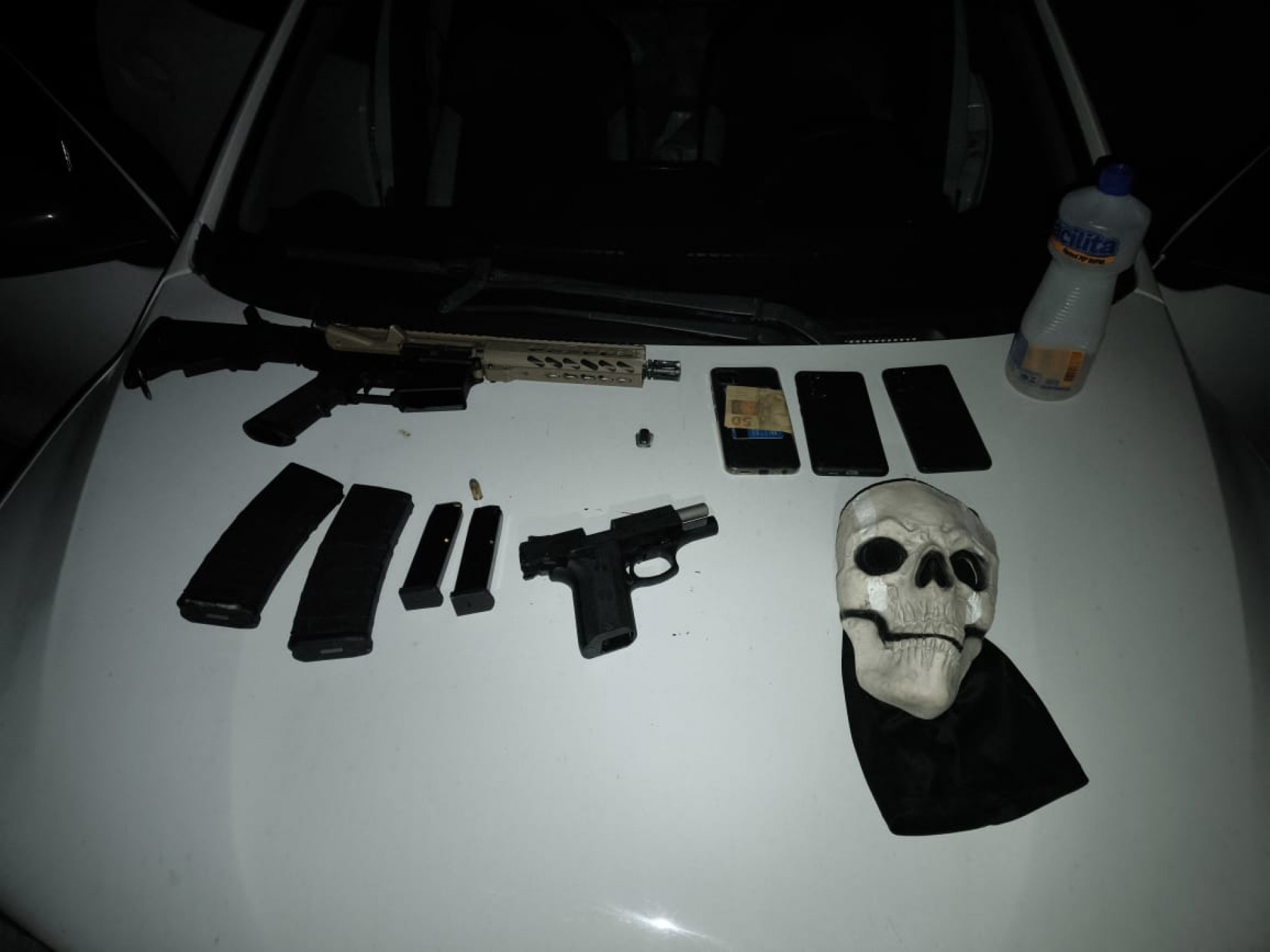 Também foram apreendidas 61 munições calibre 5.56, 31 munições calibre 380, R$ 1.400 em dinheiro, um celular e três veículos, além da carreta. Nenhum policial ficou ferido na ação.