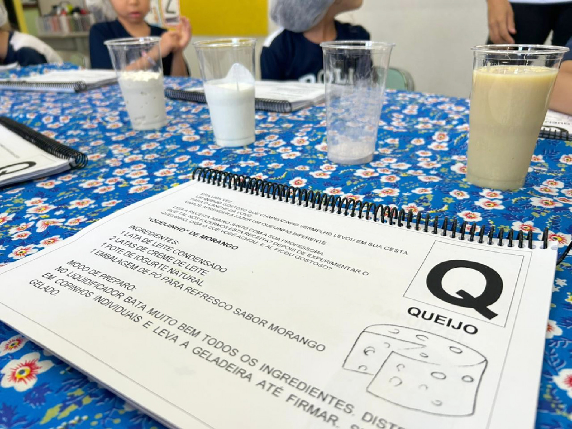 Inspirados pela história, professoras e alunos colocaram a “mão na massa” e prepararam o “queijinho de morango”. Segundo as educadoras, a atividade culinária envolveu leitura, interpretação e escrita; as crianças conheceram o gênero textual “receita” e aprenderam sobre sequência lógica, quantidades, medidas e tempo de preparo de forma divertida.