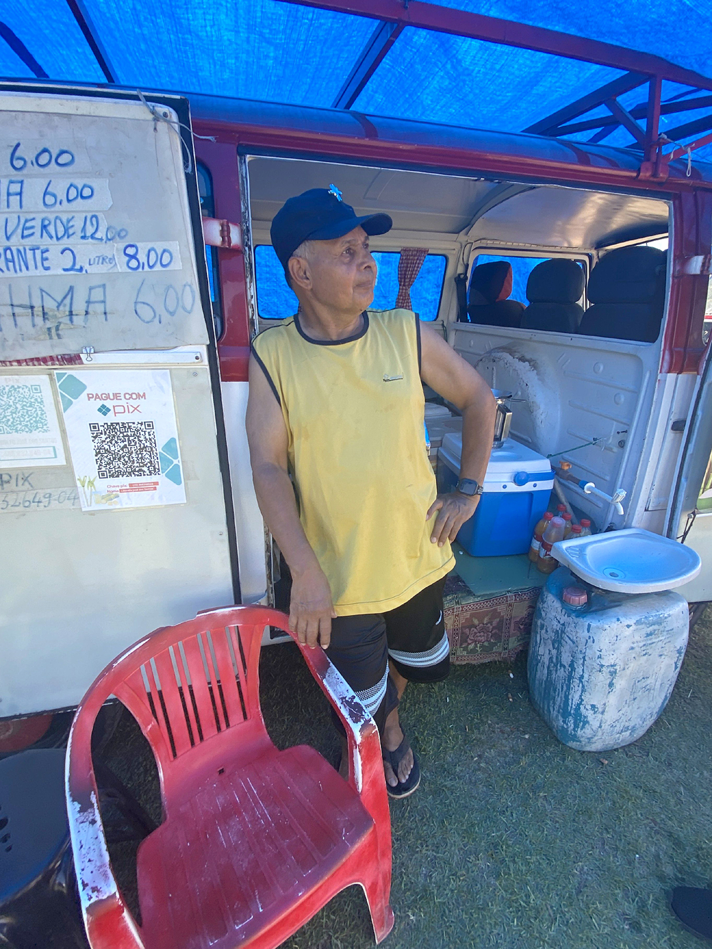 Ainda segundo ele, o vento ajuda a aliviar um pouco a sensação térmica, mas, quando o ar para, o calor se torna quase insuportável. “Quando venta, dá uma aliviada, mas quando para é difícil. Aí não tem muito o que fazer”, relata. Para aguentar a rotina, Lindolfo aposta na hidratação constante. “É muita água, água de coco e caldo de cana para ajudar a dar uma aliviada. A gente vende, mas também precisa beber.”