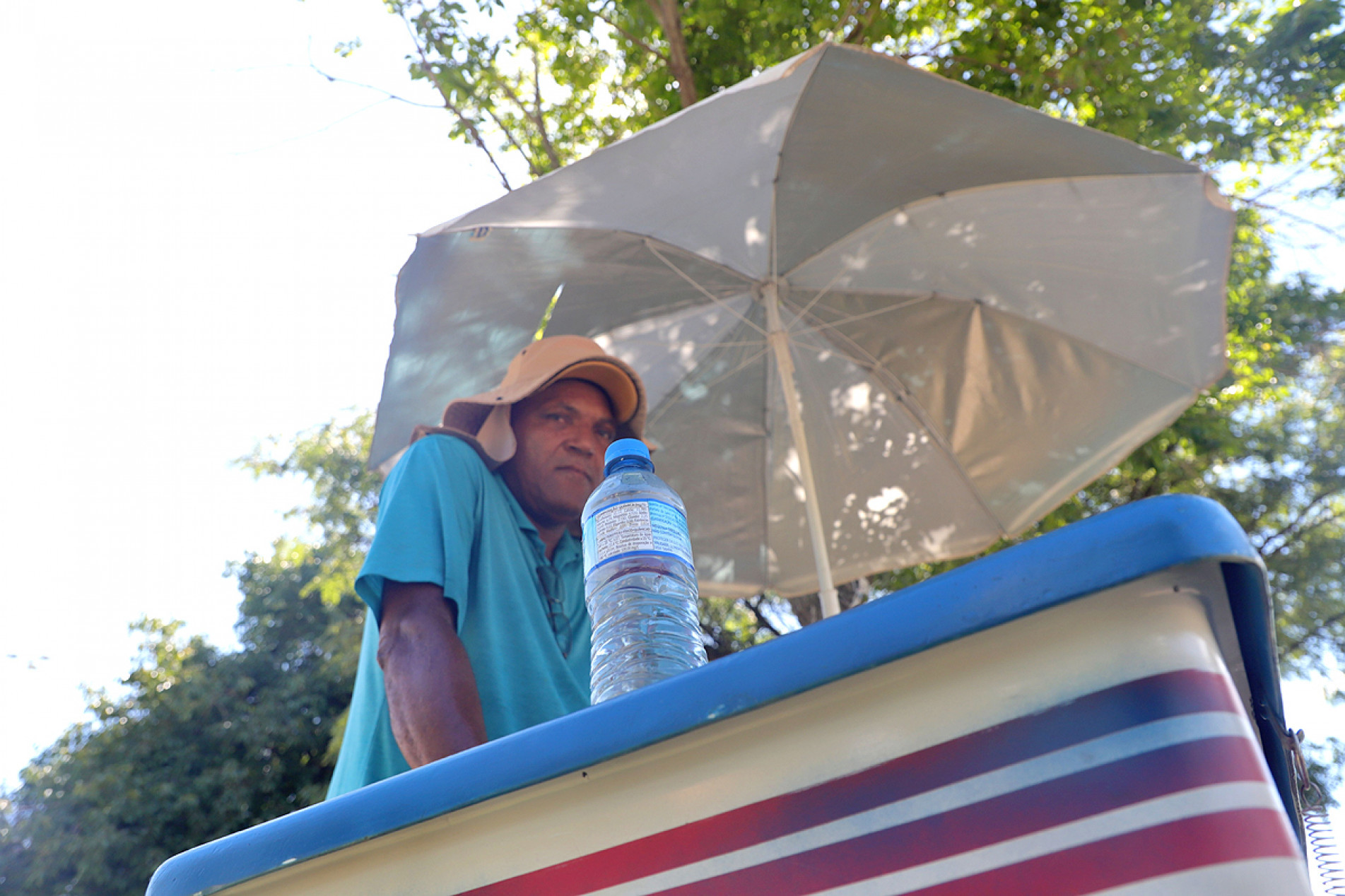 Na área de lazer atrás do Paço Municipal, o vendedor Antônio Fernandes Gonçalves, 53, enfrenta rotina semelhante. Há cerca de 12 anos trabalhando no local, ele afirma que o calor influencia diretamente nas vendas e no ritmo do trabalho. “Tem dia que vende bem, tem dia que não. Quando está muito quente, o pessoal some”, relata.