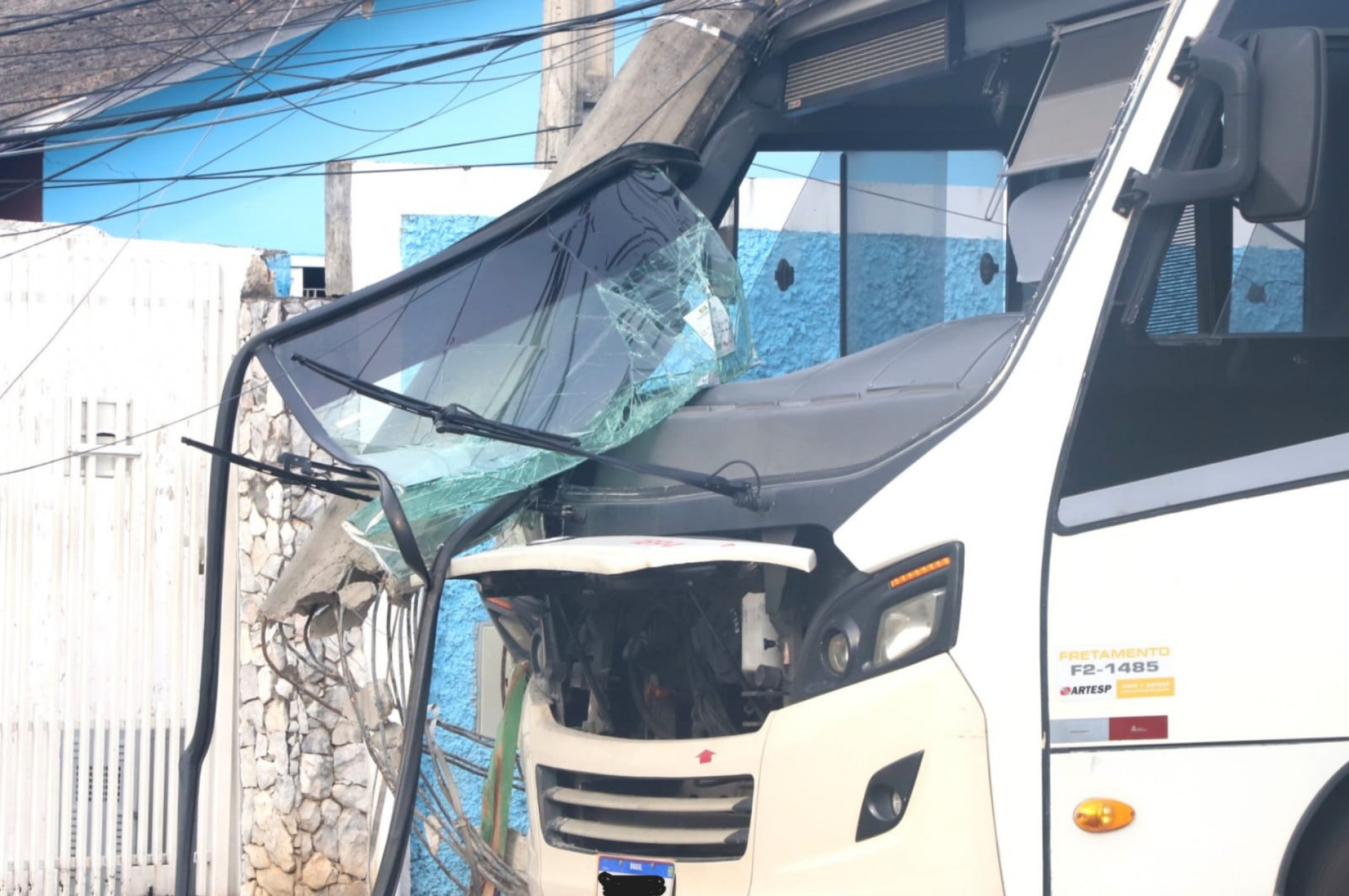 Um ônibus colidiu contra um poste na rua Agenor Leme dos Santos, próximo ao número 74, no bairro Maria Eugênia, por volta das 14h50 deste sábado (14), na zona norte de Sorocaba. De acordo com o motorista, de 43 anos, ele seguia para a garagem com o veículo, quando perdeu o controle da direção ao fazer uma curva, e acabou por atingir o poste de energia. O ônibus não transportava passageiros no momento do acidente.