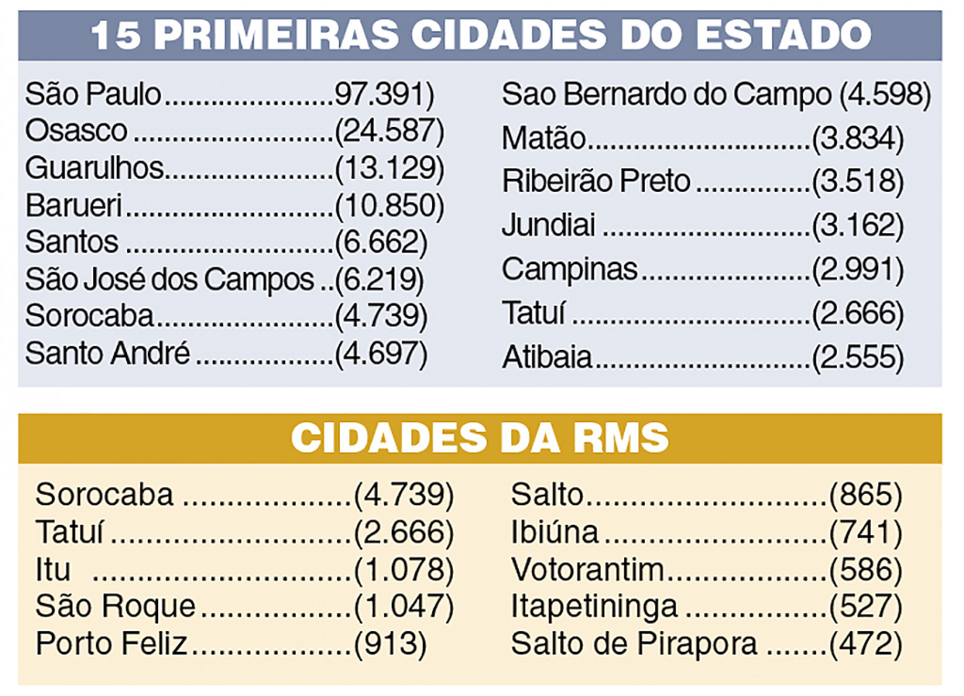 O levantamento também indica que outras cidades da região aparecem na lista, como Tatuí (2.666), Itu (1.078), São Roque (1.047), Porto Feliz (913), Salto (865), Ibiúna (741), Votorantim (586), Itapetininga (527) e Salto de Pirapora (472).