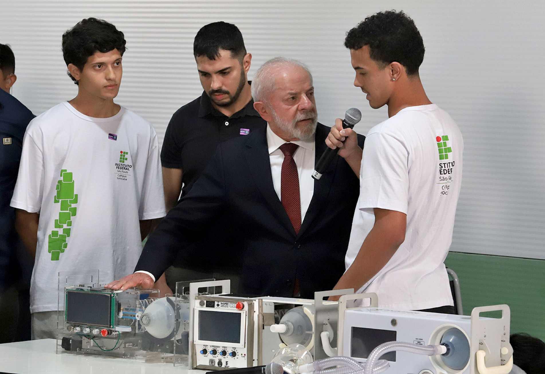 Ao chegar, o presidente conversou com cerca de 30 alunos envolvidos em projetos e conheceu sete estandes dos cursos disponíveis.