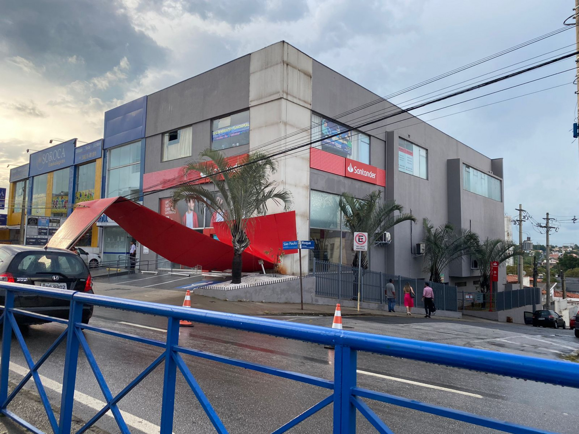 Em nota enviada à reportagem, o Santander confirmou que a placa de metal foi derrubada pelos ventos, acompanhados de chuva intensa. "O material, que complementa a comunicação visual do banco, foi arrancada por volta de 17h, quando a agência já estava fechada", diz o texto.