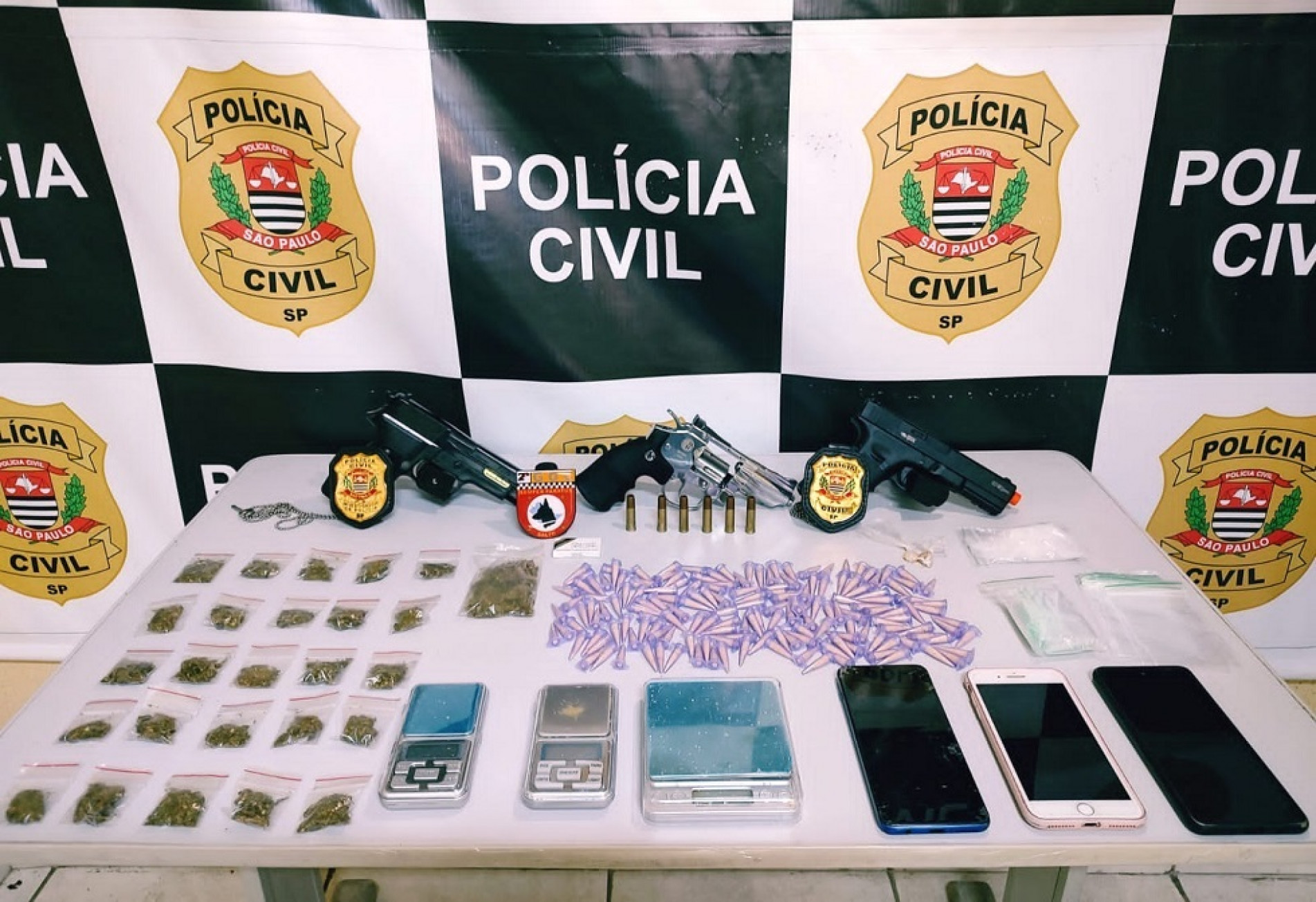 No total, foram apreendidos 163 porções de cocaína, 25 porções pequenas de maconha, uma porção grande da mesma droga, 2 pedras de crack, 3 aparelhos celulares, 3 balanças de precisão, material para embalar as drogas e simulacros de arma de fogo.