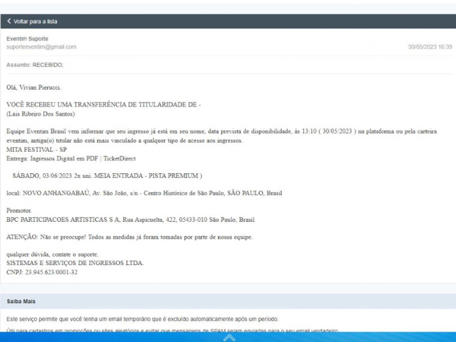 Em seguida, o homem solicitou o nome completo, CPF e e-mail da pessoa responsável pela reportagem. Foi fornecido um nome falso, um CPF gerado automaticamente na internet (sem vínculo com nenhuma pessoa real) e um e-mail temporário. O golpista, então, enviou a foto da CNH da jornalista como forma de “garantia” de que a compra não se tratava de um golpe. No e-mail informado aos golpistas, foi recebido do endereço eletrônico "[email protected]" informando uma suposta transferência de titularidade. No rodapé do e-mail, inclusive, constava o CNPJ da Eventim, empresa responsável pela venda de ingressos do evento. No entanto, nenhum PDF do convite estava anexado ao corpo da mensagem.