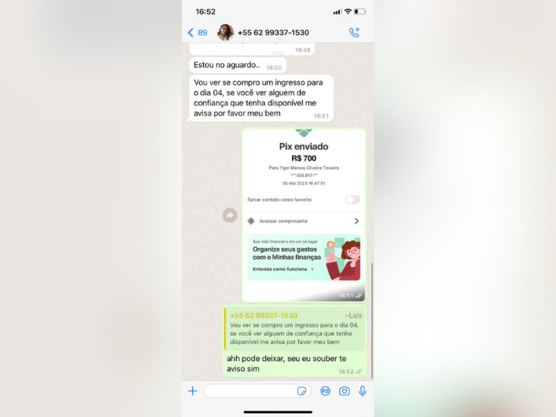 “O perfil dele tinha mais de mil seguidores e ele inclusive era seguido por artistas influentes e por uma conhecida página de fofoca. Trocamos WhatsApp... Eu nunca caí num golpe antes, mas quando trocamos mensagens, eu estava desatenta e só queria vender o ingresso logo. Infelizmente, nossos momentos de fragilidade abrem brechas para coisas ruins, coisas que eu nunca pensei que faria”, diz.
