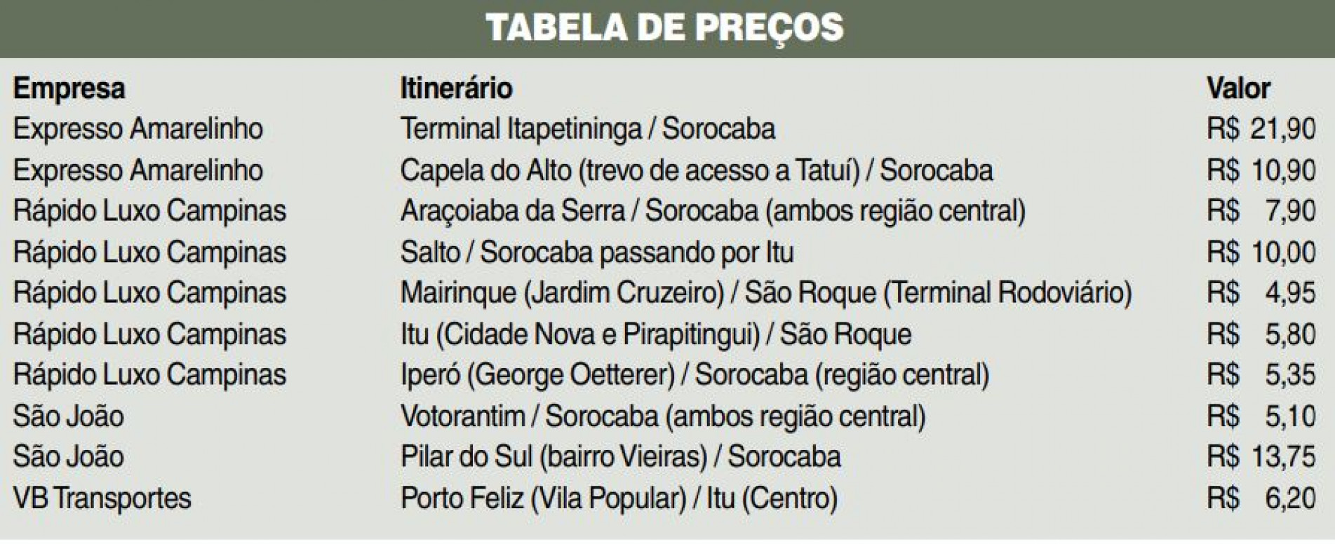 Na Região Metropolitana de Sorocaba, a passagem mais barata custa R$ 4,45. A linha tem como ponto de partida do Jardim Vitorino, em Iperó, e chegada ao centro de Boituva. Já o valor mais alto é para quem vem de Tatuí e desembarca em Sorocaba, nas proximidades do Centro Universitário Facens: R$ 30,75.