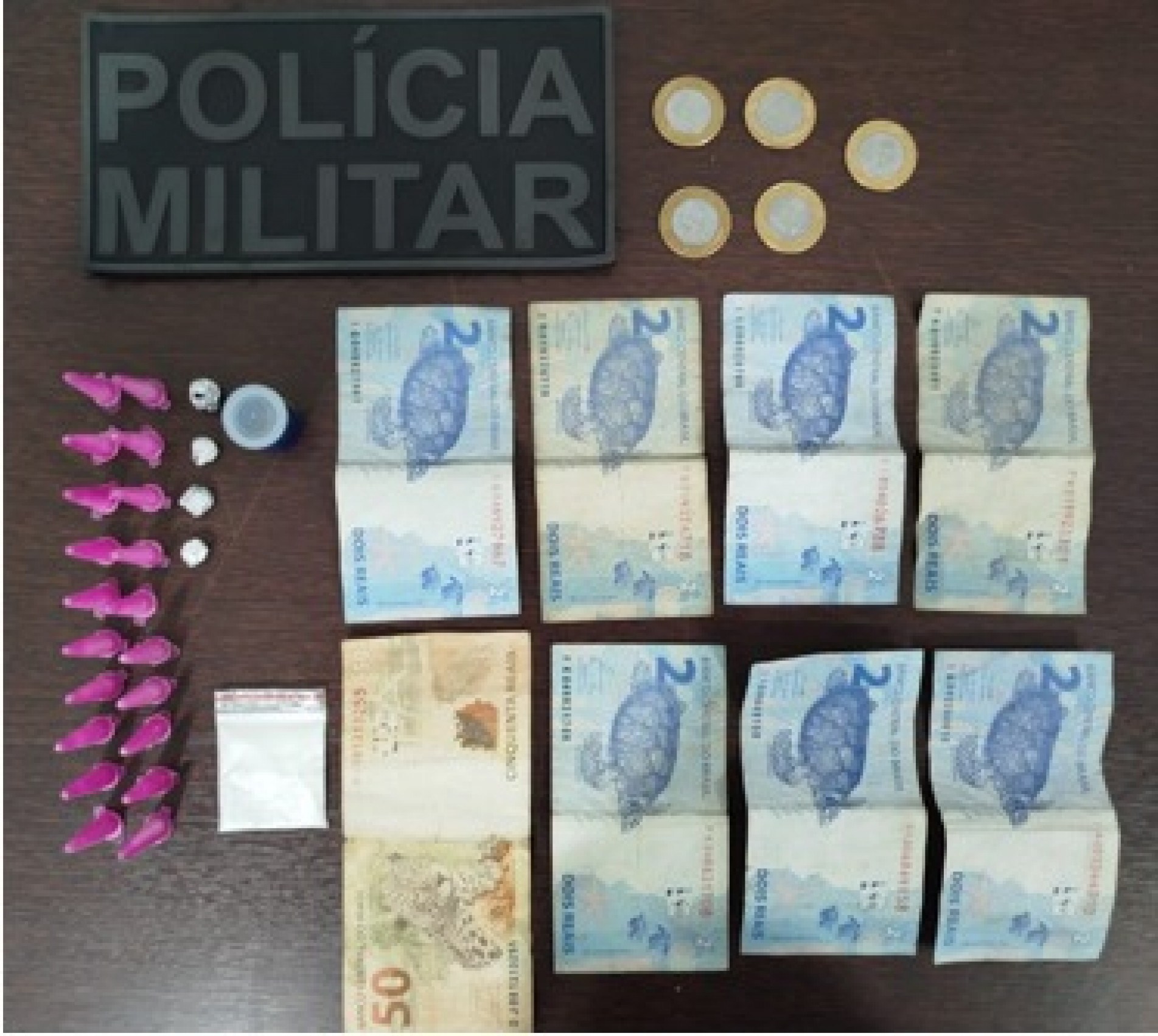 No primeiro caso, foram apreendidas 7 porções de cocaína, 36 pedras de crack, 3 porções de maconha e R$ 160,00 em dinheiro. A mulher foi levada à Delegacia de Polícia, onde permaneceu à disposição da Justiça.