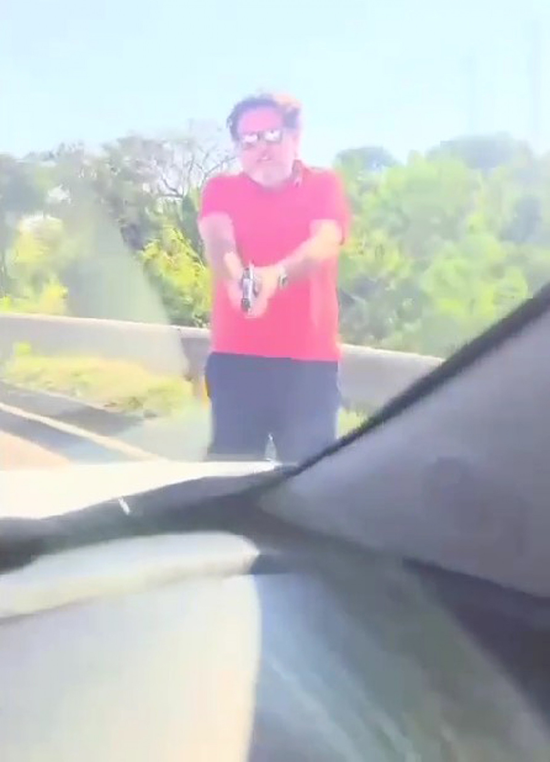 Nas imagens, primeiro, o homem armado e uma mulher descem de uma Hilux branca e vão em direção a um veículo onde está outro casal. Ao notar a arma, uma mulher fala para o marido: “Ele tá armado, fecha o vidro, fecha o vidro.” O suspeito se aproxima da janela do passageiro e grita: “O que você quer, filho da p*? Tá feliz, filho da p*? A mulher pergunta para a esposa do acusado: “Você é policial?”, e ela responde: “Sou.” A vítima rebate: “Você é policial e ele tá com a sua arma?”.