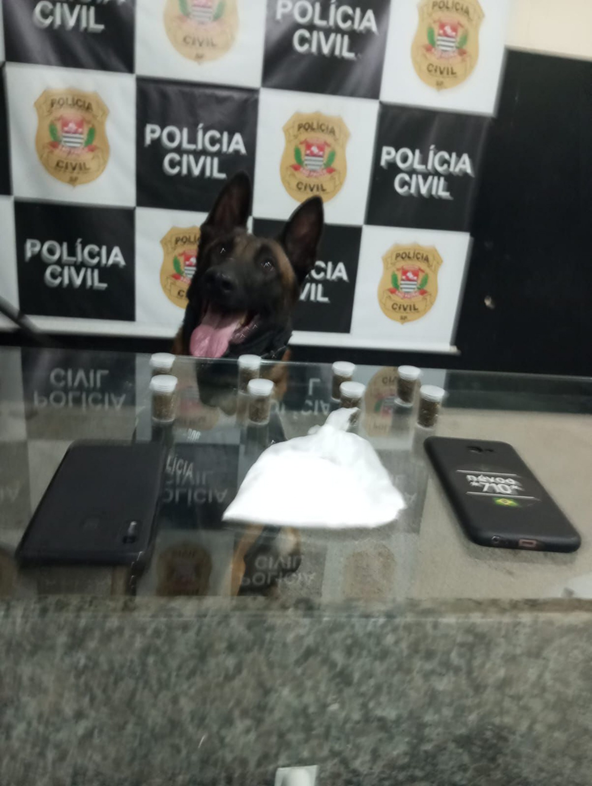 A polícia, com o mandado e com o suporte da equipe K9 e do cão farejador Bóris, foram ao endereço da dupla para cumprir a ordem judicial. Durante a busca, foram encontradas oito porções de maconha armazenadas em frascos acrílicos, uma porção de cocaína a granel e aparelhos celulares.