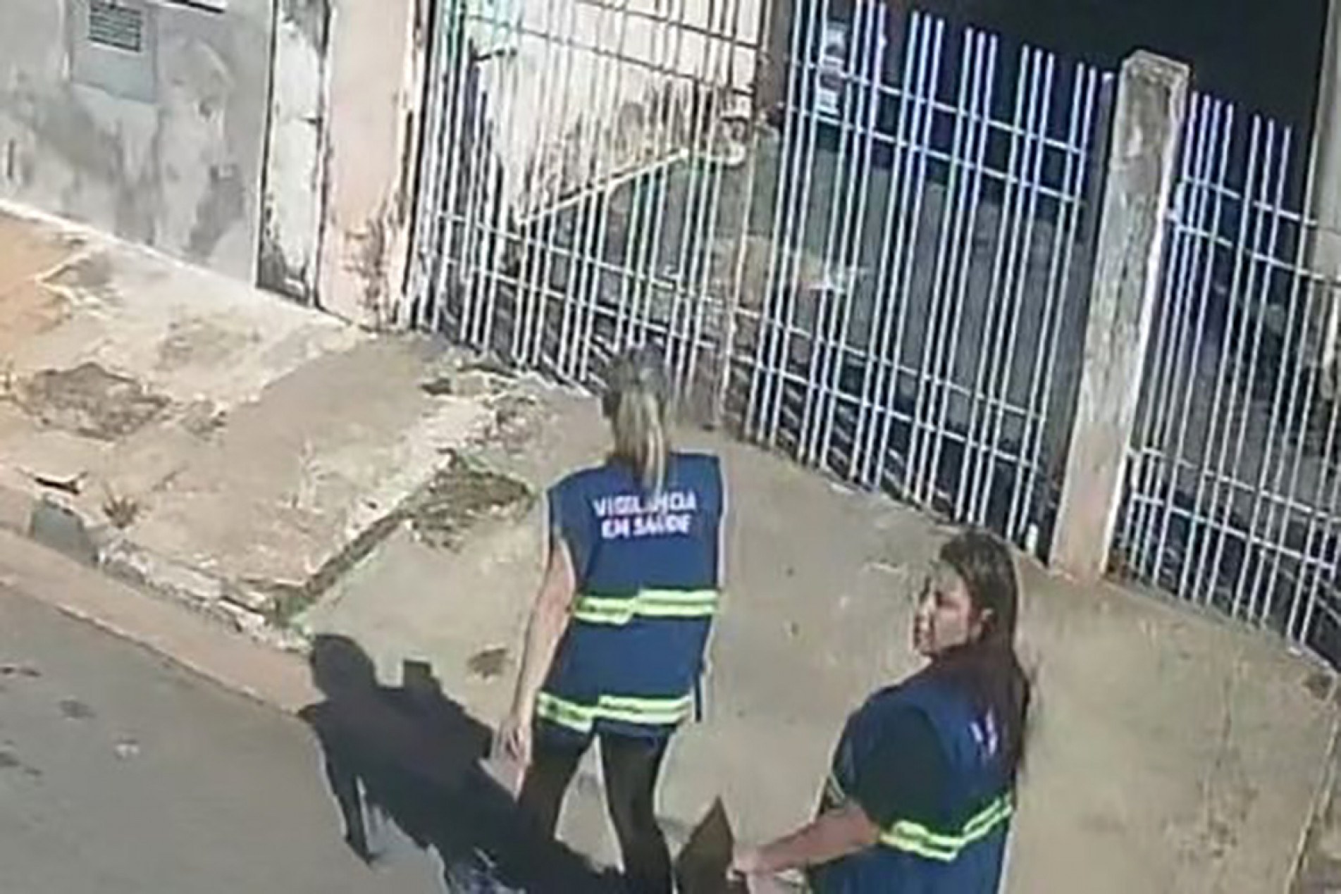 Imagens mostram duas mulheres usando coletes azuis, com os dizeres Vigilância em Saúde em amarelo, caminhando por uma rua e indo em direção a casas.