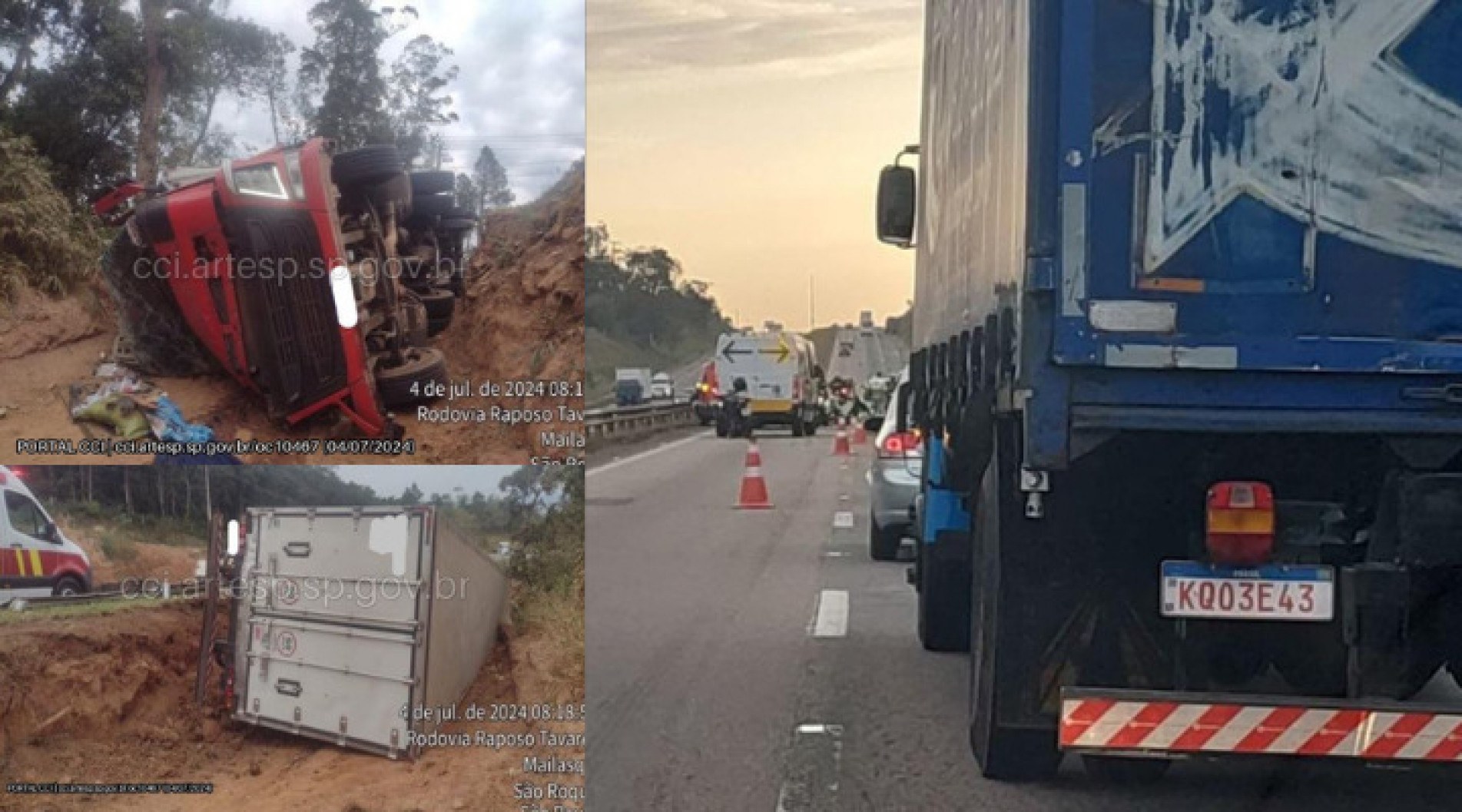 Dois acidentes foram registrados hoje de manhã na região de Sorocaba. Um deles foi na rodovia Raposo Tavares, altura do km 49. Segundo a Polícia Rodoviária, uma carreta carregada com paletes, vindo de Minas Gerais, foi no acostamento para um carro passar, o motorista perdeu o controle e tombou a carreta no canteiro. A cabine ficou destruída, o motorista foi removido e levado para a Santa Casa de São Roque em estado grave.