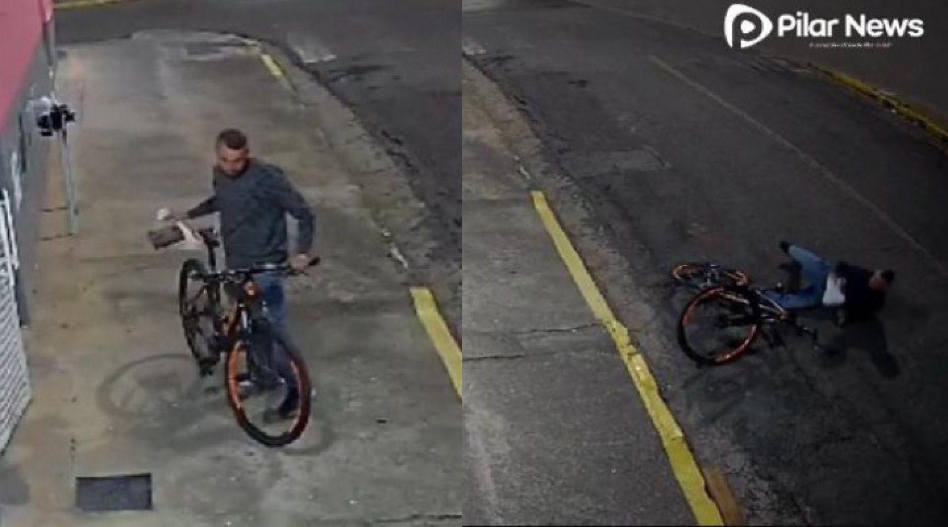 O suspeito ainda disfarça e vai até a esquina. Na volta, arromba o portão e furta a bicicleta marca KSW, aro 29. Mas, na hora de sair "pilotando a bike", ele se atrapalha e cai. Em seguida, levanta-se e consegue sair pedalando.