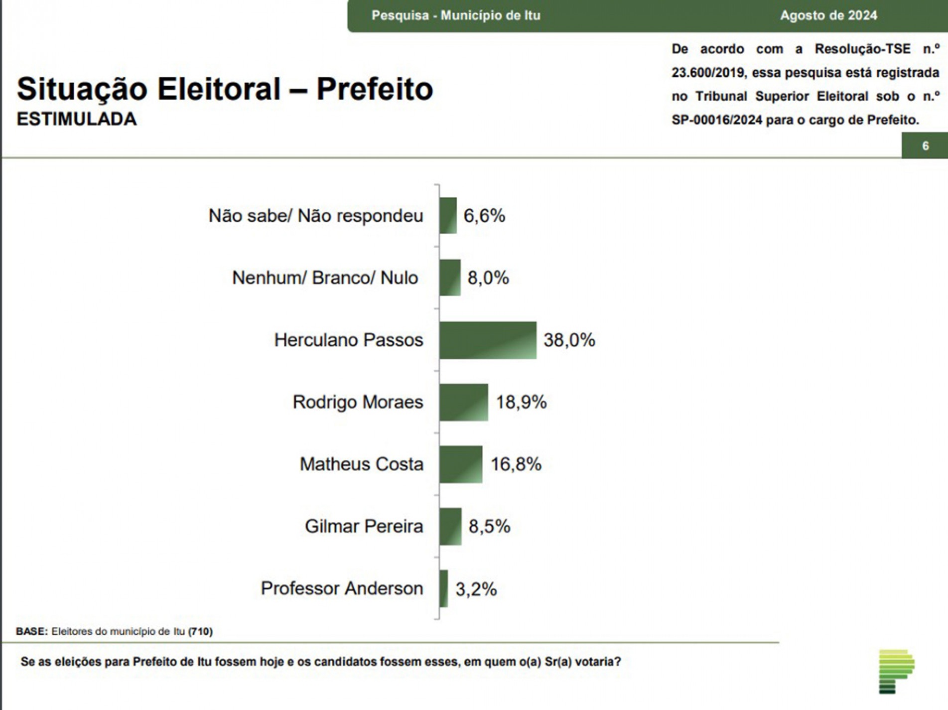O Instituto Paraná também fez uma pesquisa de intenção de voto ao cargo de prefeito de Itu. A divulgação ocorreu em 13 de agosto. Na pesquisa estimulada, Herculano Passos (Republicanos) aparece na primeira posição, com 38% das intenções. Em seguida está Rodrigo Moraes (PL), com 18,9%; 16,8% dos eleitores disseram que votariam, se as eleições fossem naquele dia, em Matheus Costa (PSD), 8,5% em Gilmar Pereira (PP) e 3,2% no Professor Anderson (PT). Além desses, 8% informaram que votariam branco, nulo ou em nenhum dos candidatos. Já 6,6% não sabiam em quem votar ou não responderam.