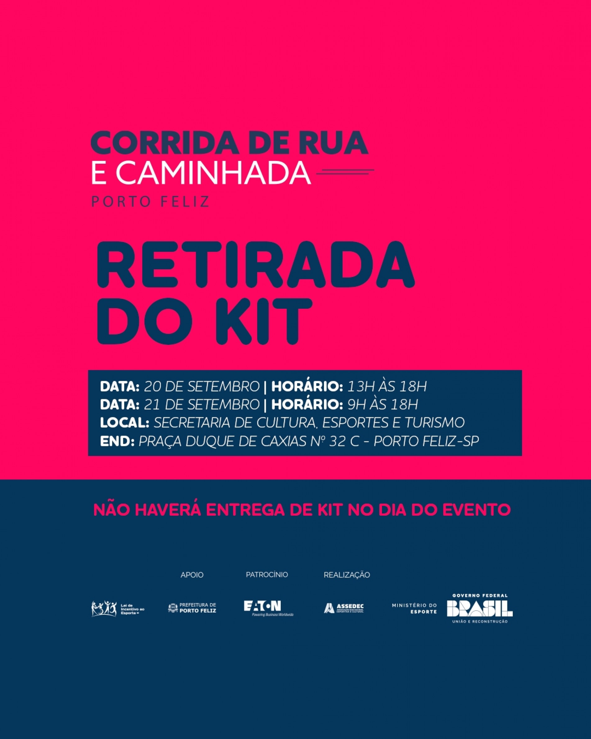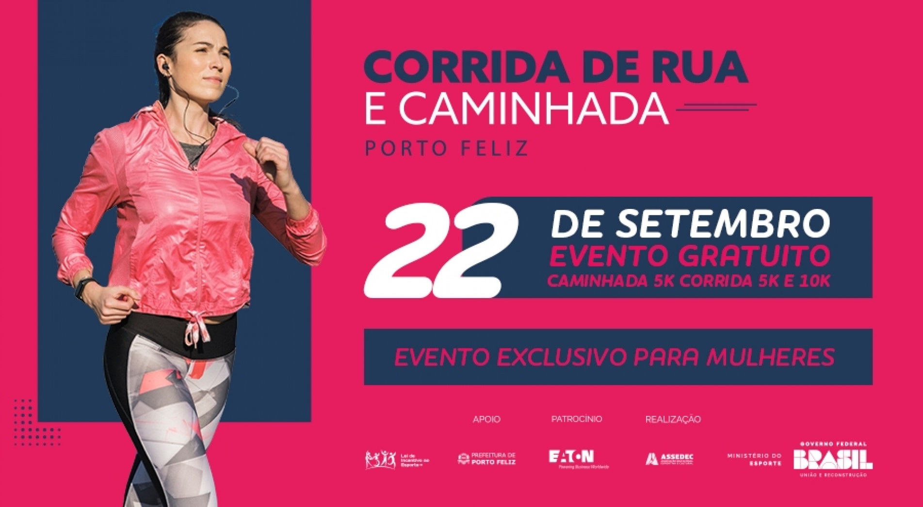 A 'Corrida de Rua e Caminhada Porto Feliz' está marcada para acontecer no dia 22 de setembro, a partir das 6h, com largada na avenida Hércules Florence, próximo ao nº 320, em Porto Feliz. As opções de corrida são para 5 e 10 km, e terá caminhada de 5 km.
