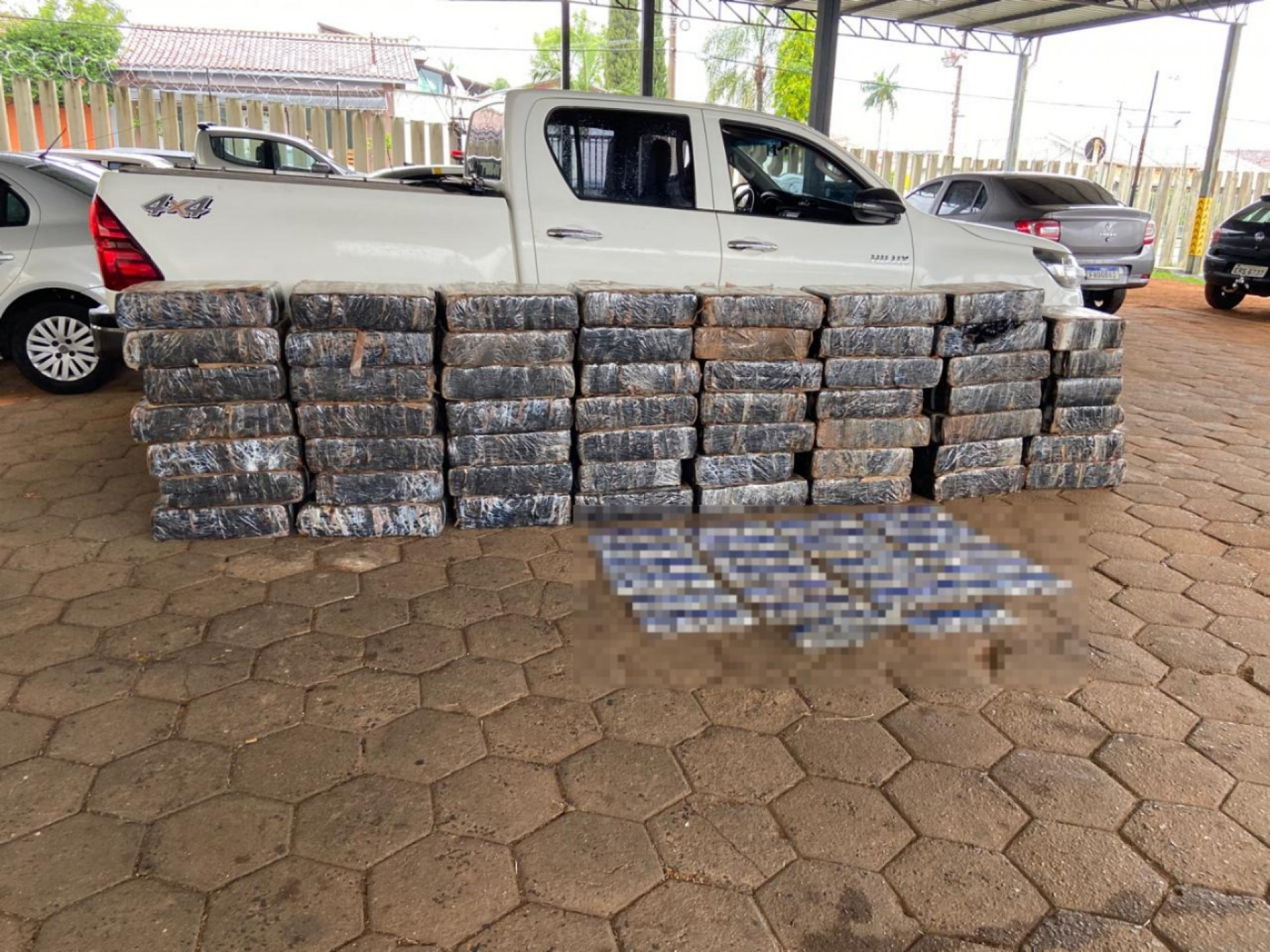 Na abordagem os militares sentiram o cheiro de maconha e então iniciaram a vistoria. Na carroceria, encontraram 1.384 tijolos da droga, além de diversas placas. Ao consultarem o sistema criminal, constatou-se tratar de um veículo furtado em abril deste ano. No veículo também estavam várias placas adulteradas.