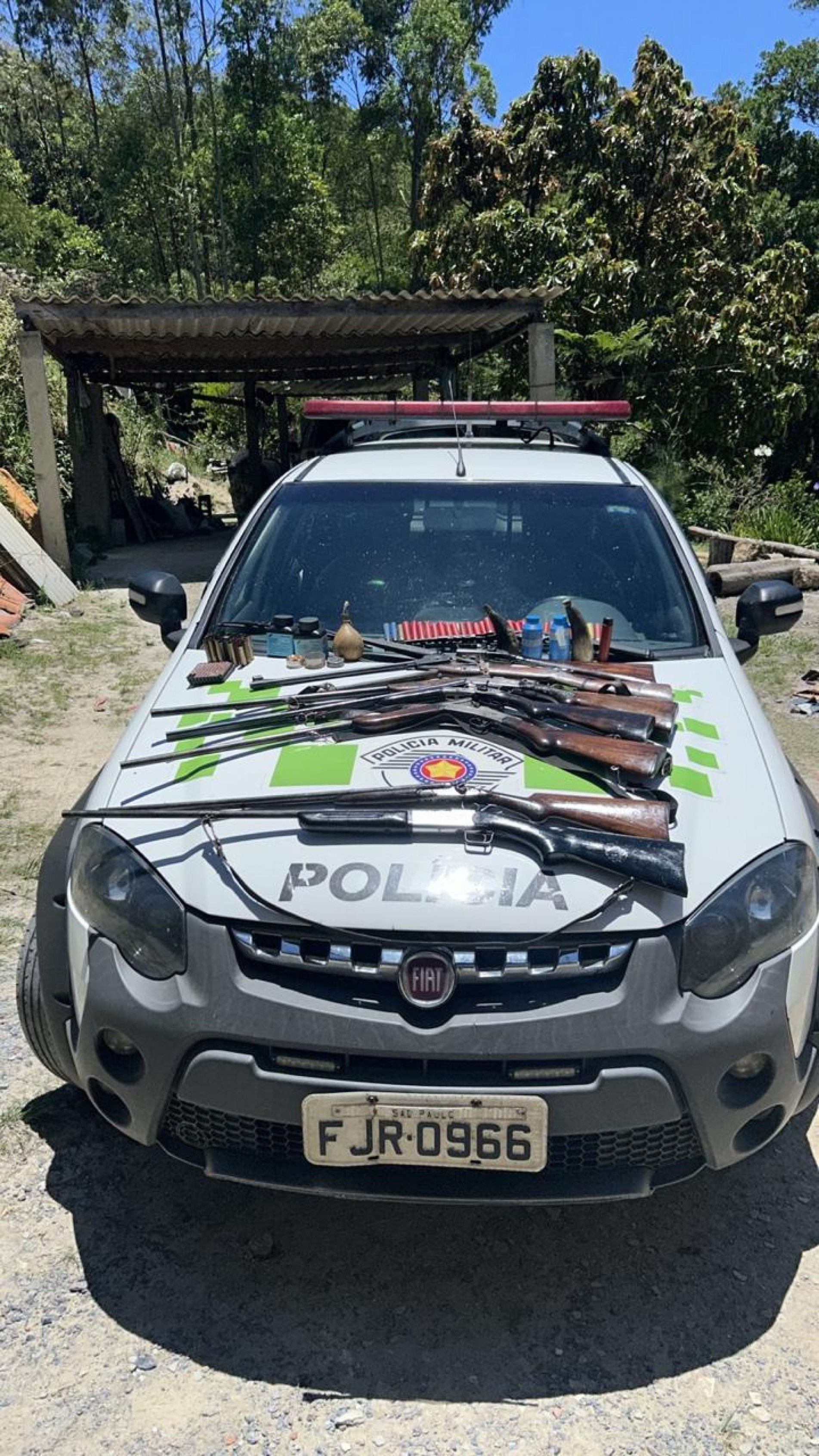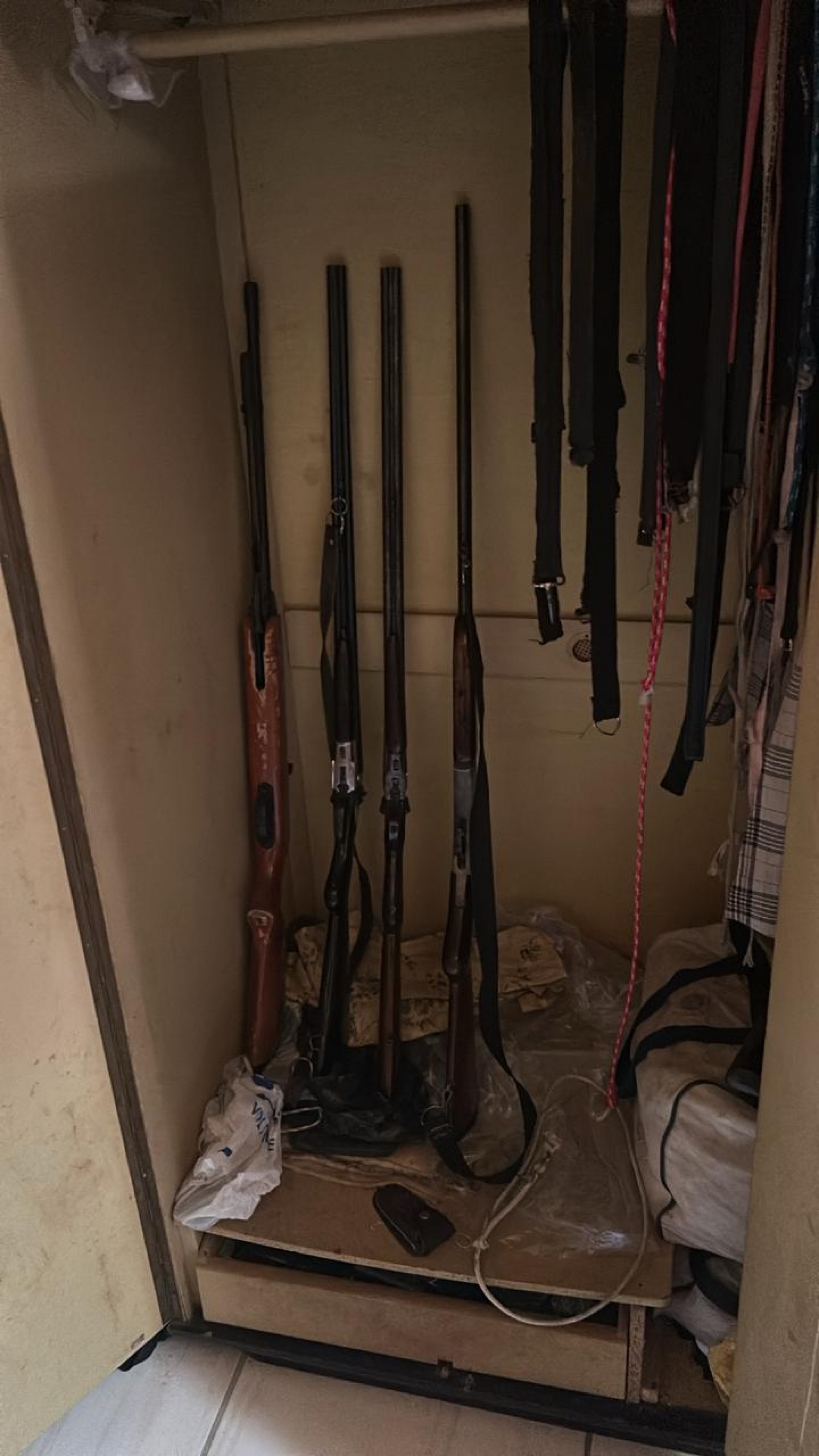No endereço informado, foram encontradas cinco espingardas, munições e outros objetos para caça. O morador do local foi questionado sobre o material encontrado e afirmou não ter documentação para a posse das armas e munições, resultando em prisão em flagrante.