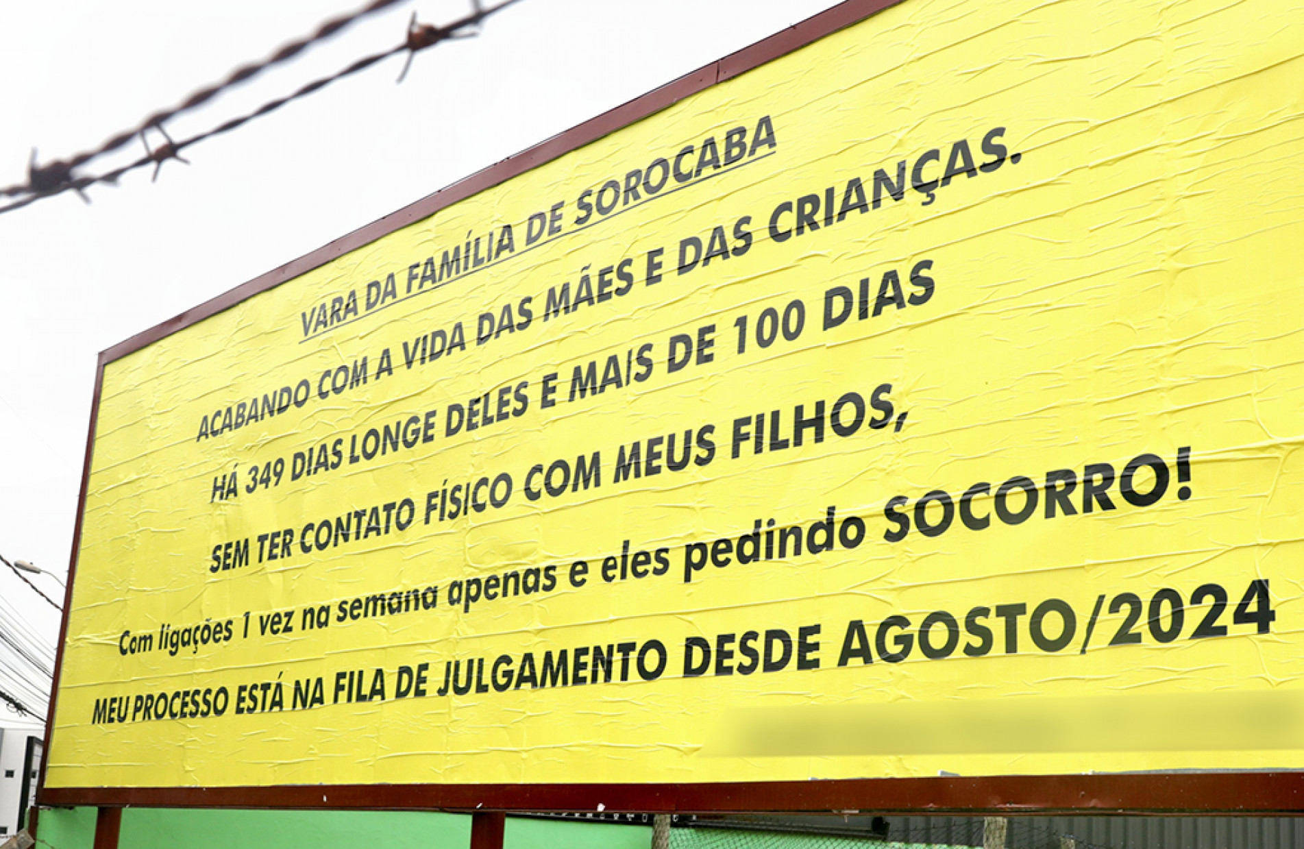 A placa contém um fundo amarelo e o seguinte texto escrito em letras pretas: “Vara da Família de Sorocaba acabando com a vida das mães e das crianças. Há 349 dias longe deles e mais de 100 dias sem ter contato físico com os meus filhos, com ligações 1 vez na semana apenas e eles pedindo socorro! Meu processo está na fila aguardando julgamento desde agosto/2024”.
