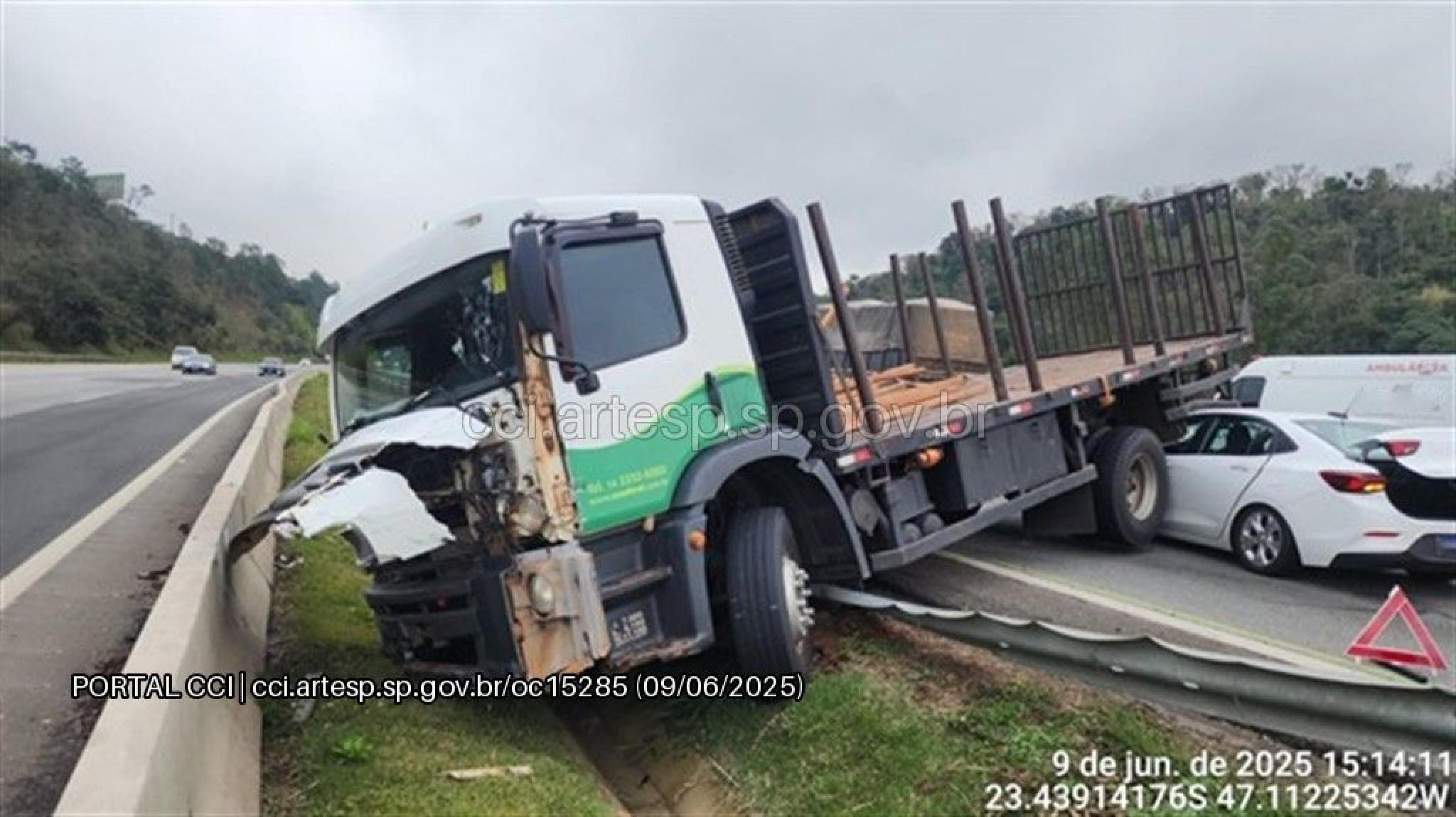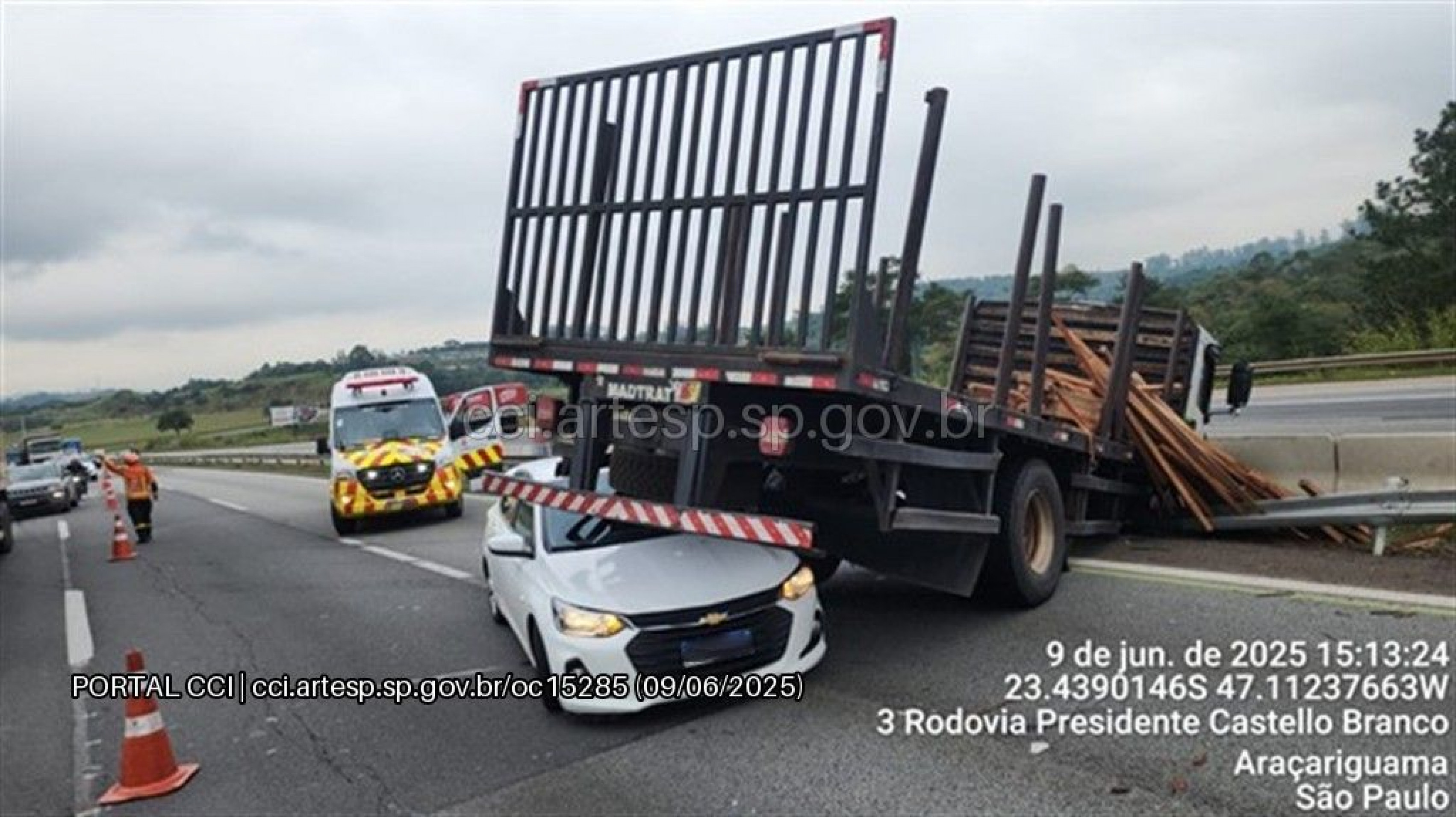 De acordo com a Agência de Transporte do Estado de São Paulo (Artesp), o caminhão trafegava pela faixa dois quando o motorista perdeu o controle da direção e atingiu a defensa metálica do canteiro central, derrubando parte da carga. Em seguida, um carro que seguia pela faixa um, sem tempo para frear, colidiu com o caminhão e ficou preso embaixo dele.