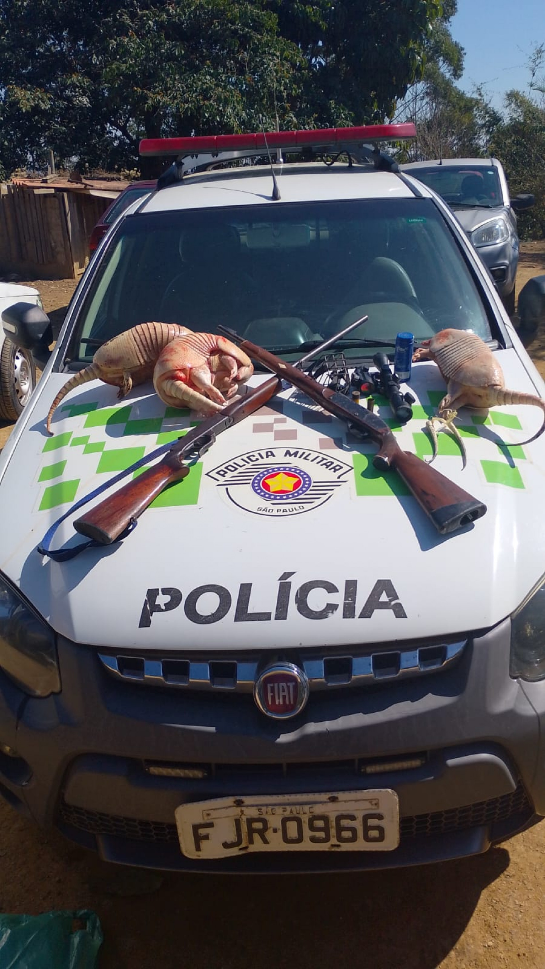 No local, os oficiais ainda encontraram duas espingardas com munições e cartuchos, além de apetrechos de caça e três espécies de tatu-galinha abatidas