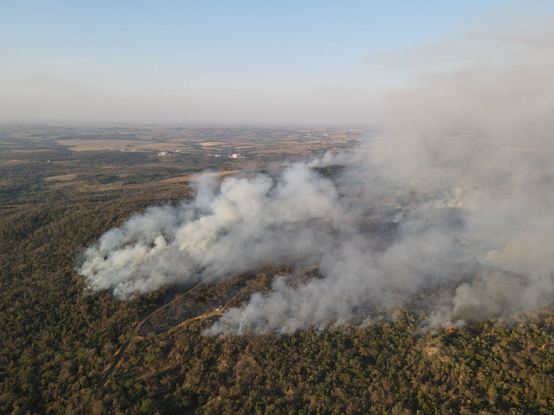 Chegando próximo a Floresta Nacional de Ipanema, é possível ver a fumaça que forma uma grande "neblina". O ar seco e o cheiro de fumaça pode ser sentido na região.