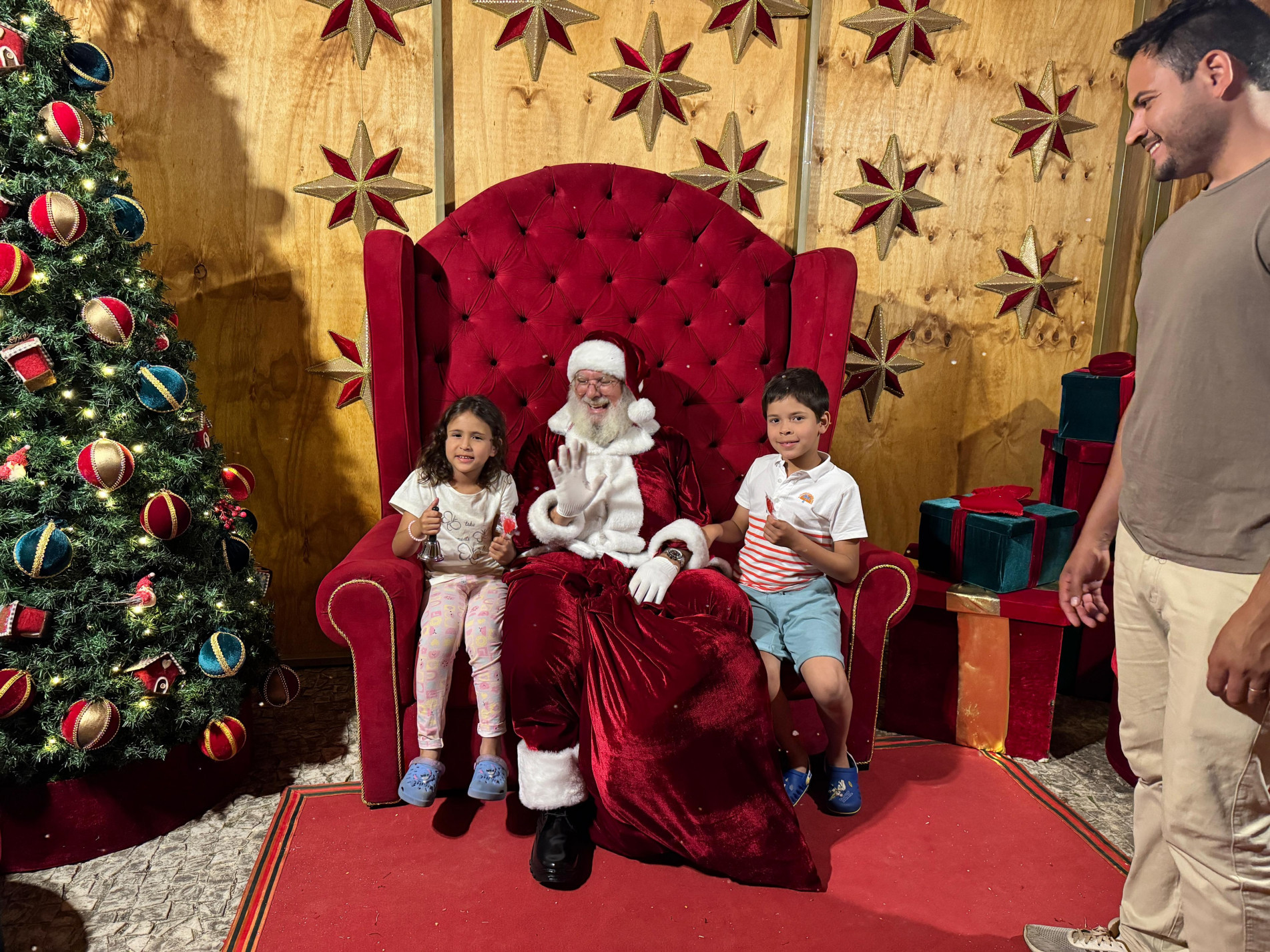 José Carlos Francisco Neto, 6 anos, acompanhava tudo confortavelmente nos ombros do pai, o professor José Carlos Francisco Filho, 44. “É legal. Eu gosto quando o Papai Noel chega”, diz o menino. Já para o pai, o momento tem um significado especial. “Eu trago ele para vivenciar um pouco desse momento mágico que a gente precisa passar para as crianças. O Natal é família, união, amor, pazà um pouco de tudo isso”, afirma.