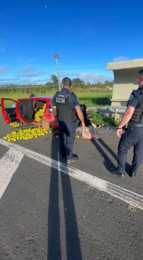 Durante a vistoria, os guardas encontraram 25 caixas de laranja, totalizando aproximadamente 550 quilos, além de dinheiro em espécie. Um dos acusados também portava pinos com substância branca.