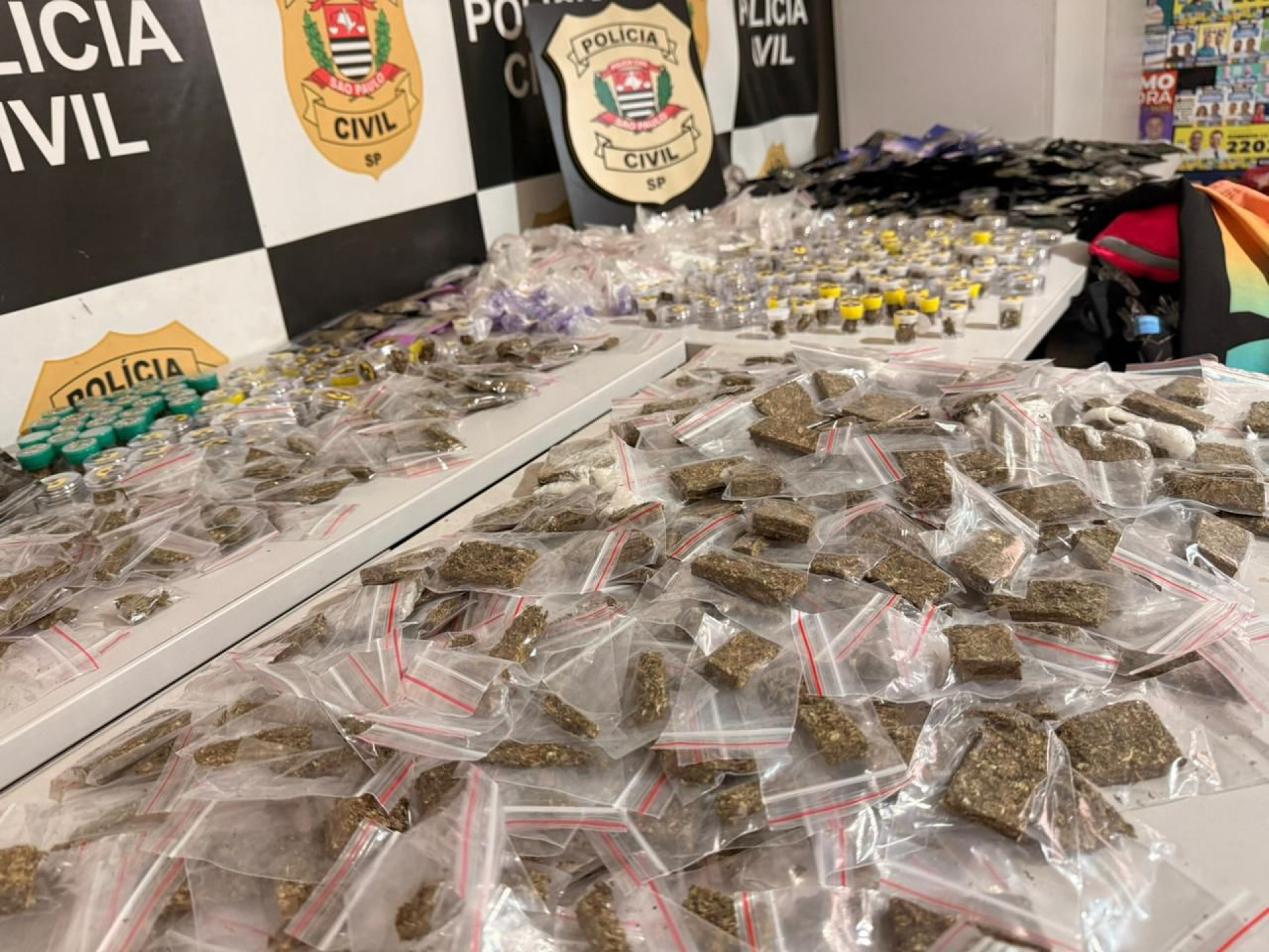 Ao todo, a Polícia Civil apreendeu 523 porções de dry, 228 de crack, 206 de cocaína, 5 de ecstasy, 32 de haxixe e 1.095 porções de maconha