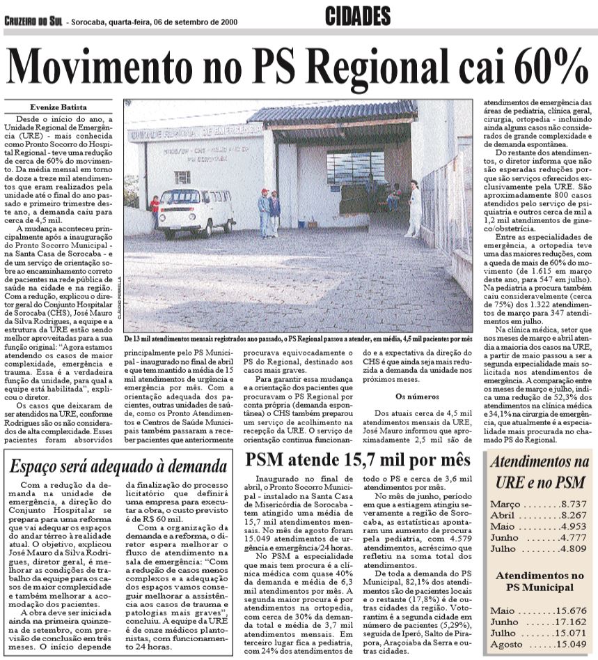 O jornal Cruzeiro do Sul noticiava em sua edição de 6 de setembro de 2000 a redução de 60% no movimento no PS do Conjunto Hospitalar de Sorocaba, após a inauguração do Pronto-Socorro Municipal na Santa Casa de Sorocaba. A média mensal de 13 mil atendimentos foi reduzida para 4,5 mil.