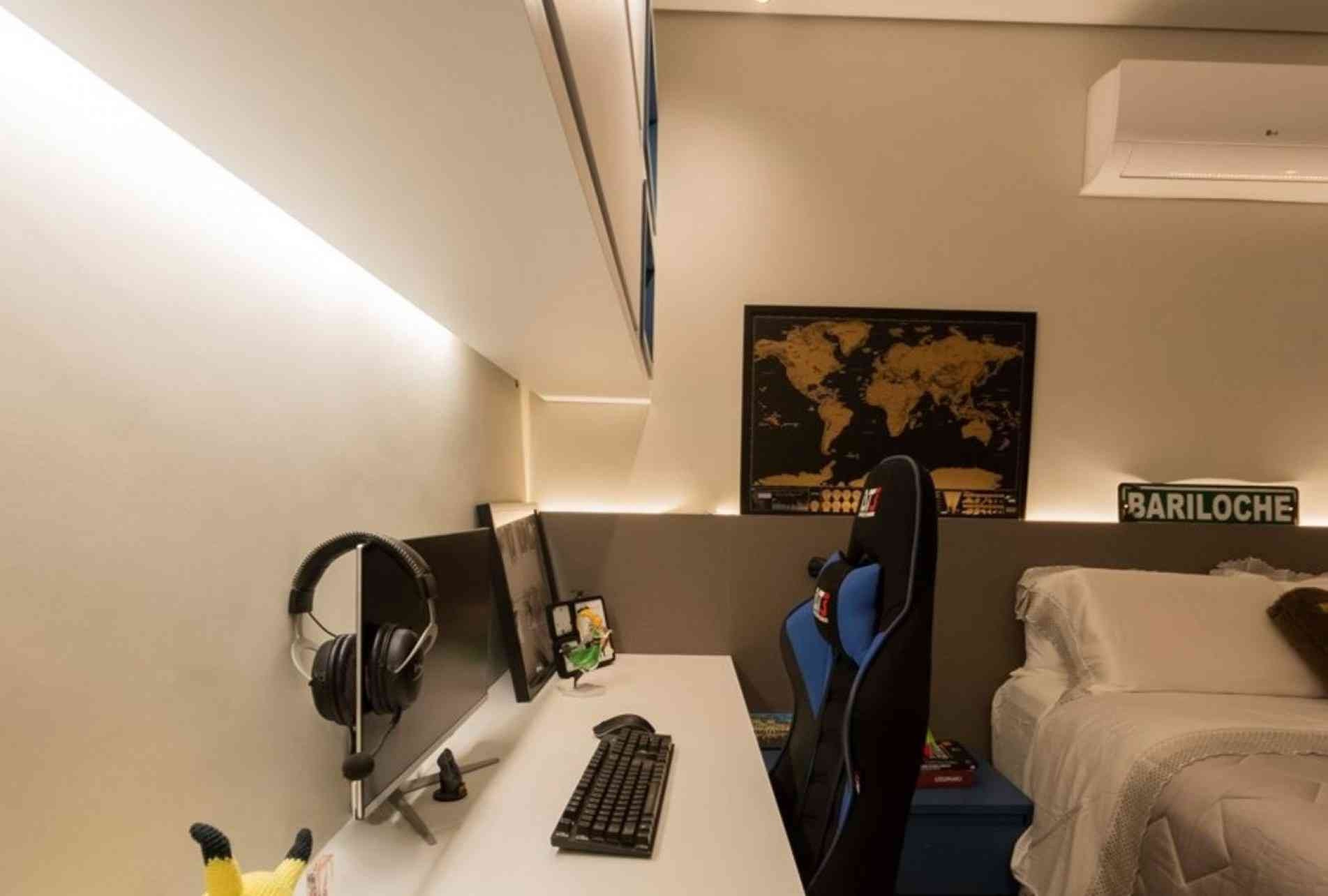 Para as crianças mais crescidinhas, a dica é apostar em iluminações indiretas em determinadas áreas que necessitem de uma luz mais suave; luzes difusas para iluminação geral; e pontos focais, todas em circuitos diferentes para o melhor desempenho do projeto. Convém apostar não somente em uma única solução luminotécnica, mas sim em várias, como os abajures, arandelas, luminárias de piso, plafons e pendentes em vários locais do quarto e não somente no teto, respeitando sempre a particularidade de cada situação.