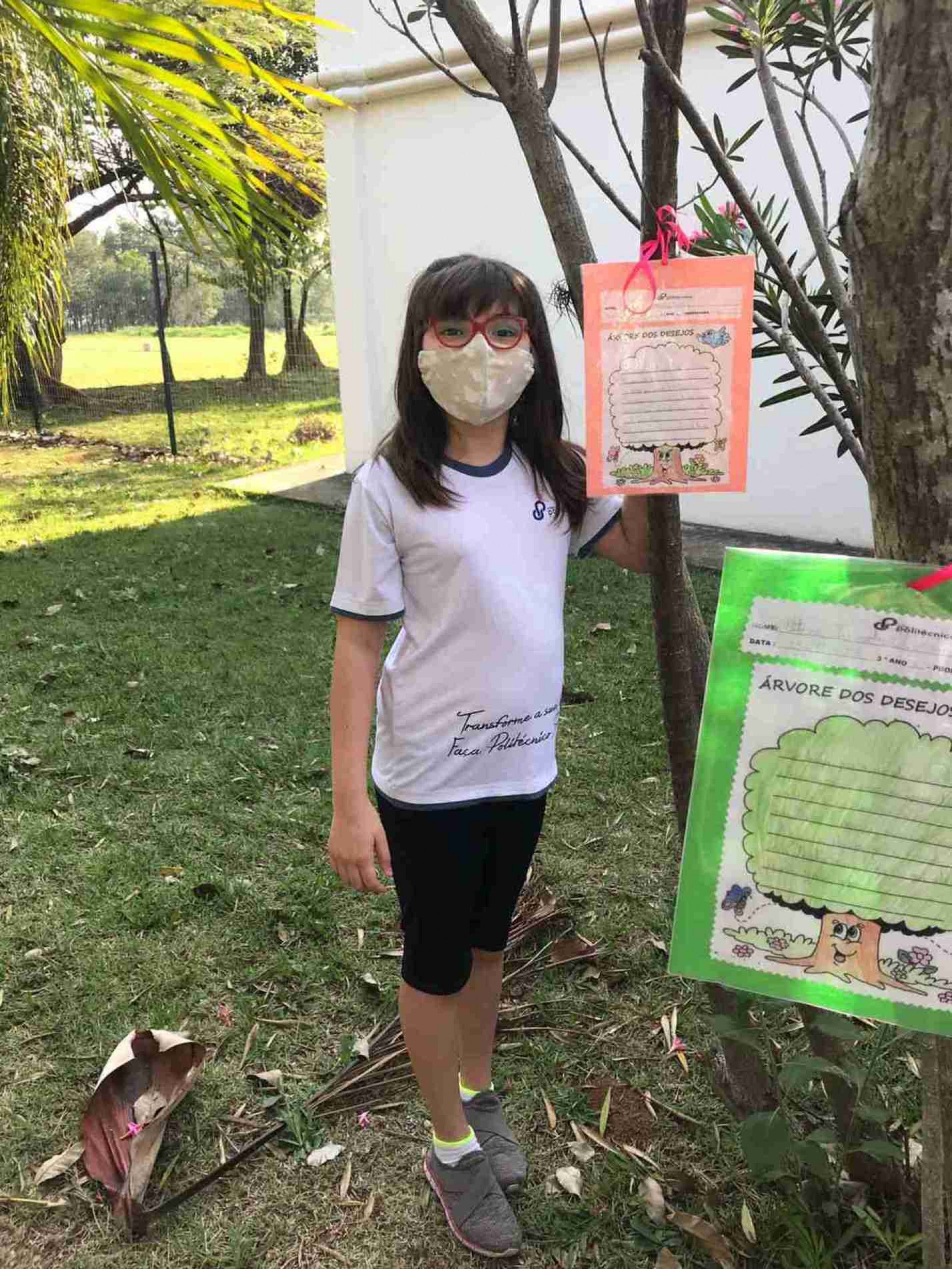 Para a Bianca de Oliveira Lourenço, de 9 anos, a parte mais divertida foi pendurar as cartinhas na árvore dos desejos. Na carta, a menina desejou que a avó ganhe na Tele Sena, que a Covid acabe logo e que não tenha mais poluição no mundo. E para isso, precisamos cuidar das árvores. “Elas produzem o oxigênio e deixam o ar mais purificado. É por isso que quando estamos perto da mata o ar é mais fresquinho”.