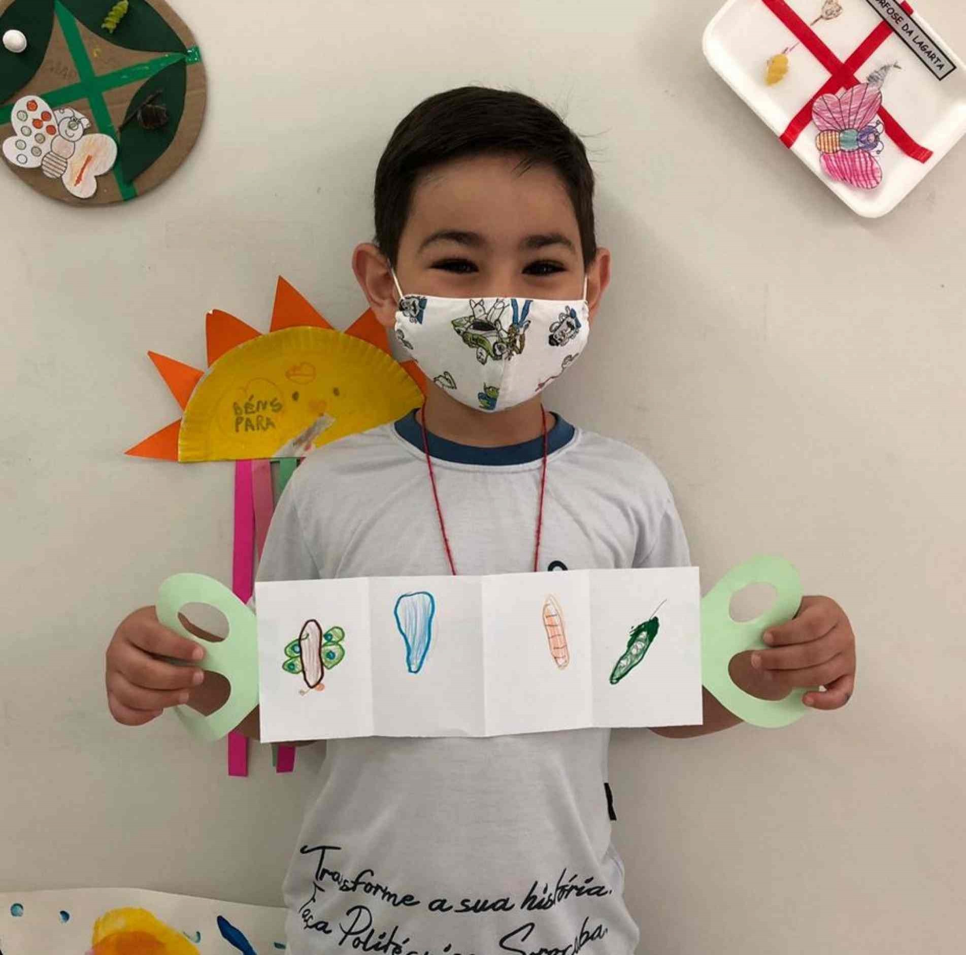 O Théo Rondelo, de 6 anos, adorou participar das atividades. O menino ficou fascinado ao ver a borboleta voando. “Não deu tempo de ver ela saindo do casulo. A borboleta era laranja e preta”. Théo ainda fez várias pinturas e desenhos para ilustrar a metamorfose. “A minha parte preferida foi fazer o ciclo da borboleta”, diz ao mostrar o desenho, todo colorido e caprichado.