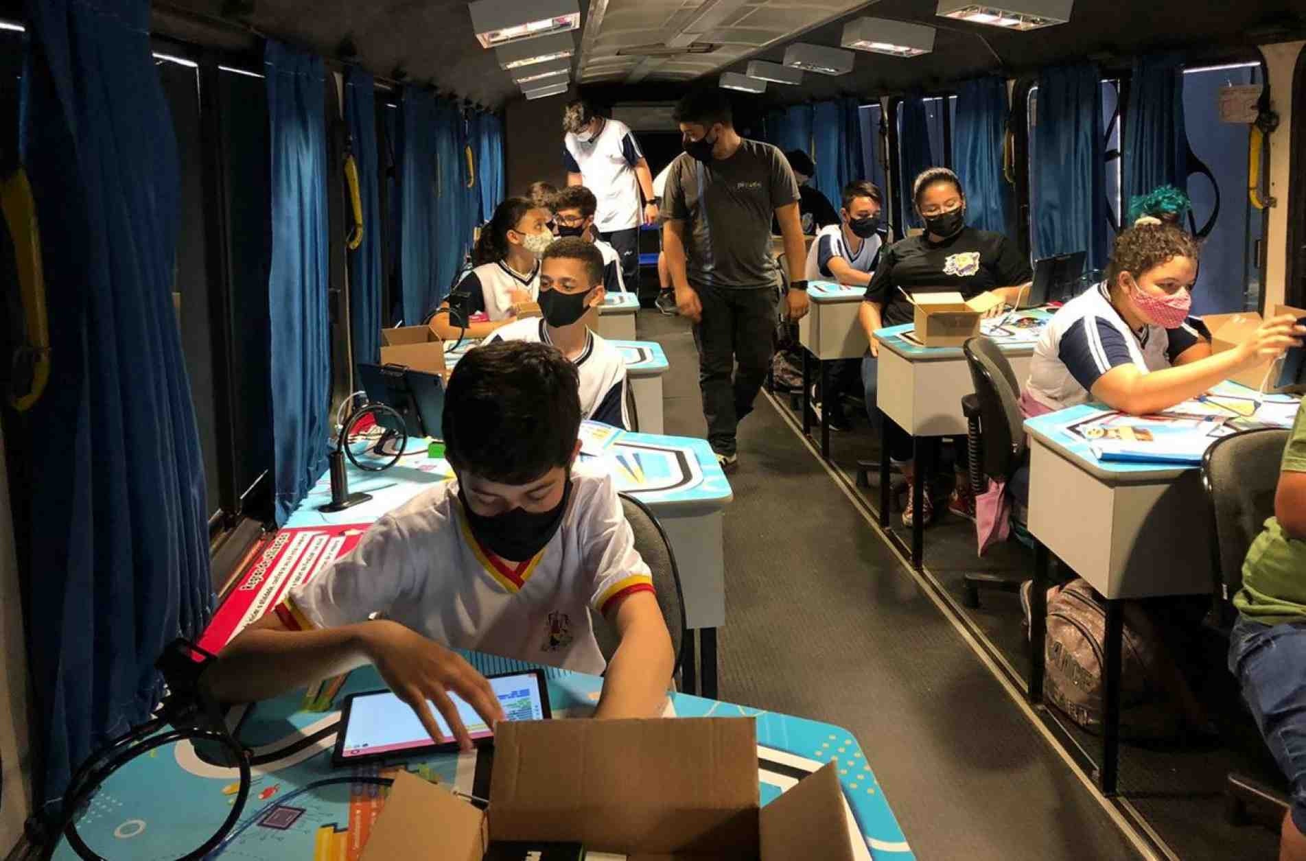 Além do laboratório, os alunos ainda contam com o ônibus itinerante PTS na Escola, uma extensão do Fab Lab que levará as atividades até as unidades escolares. Desta vez, foram os estudantes do 9º ano da EM Achilles de Almeida que receberam o ônibus na porta da escola. Dentro do veículo, que conta com tablets, placas e vários equipamentos tecnológicos, os alunos aprenderam sobre programação e robótica. Uma das atividades era simular o som da sirene de uma ambulância.