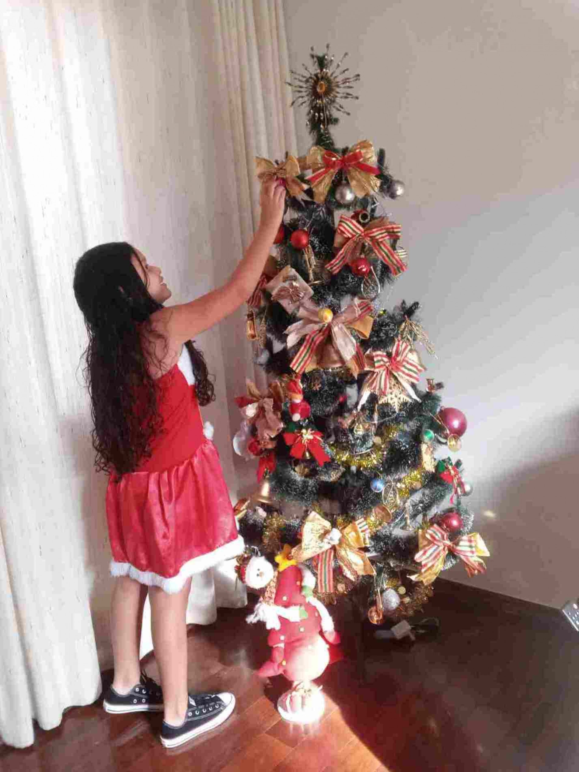 A menina, que vai para o 3º ano do ensino fundamental, acredita que esse Natal vai ser muito legal. “Eu vou para a praia com o papai e a mamãe, vou aproveitar bastante. Depois volto para ver a minha família aqui”. Apaixonada pelo clima natalino, Maria já está ansiosa para a chegada do dia 25. “Ano passado eu fiquei em casa, por conta da pandemia não fui viajar, mas ganhei presente. Estava sentindo falta de viajar e comemorar com a família. É uma data muito importante e especial, porque é o nascimento de Jesus”, destaca ao dizer que ama o Natal. Além dos presentes, a parte preferida da Maria é a comilança. “Eu gosto de comer chester, farofa, doces, panetone, chocotone e várias coisas no Natal. Eu como de tudo”, brinca.