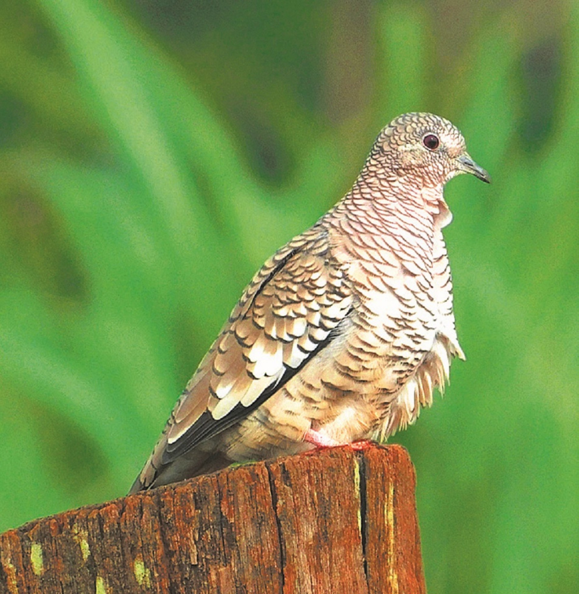 O formato geral e as bordas escuras das penas que cobrem seu corpo lhe oferece uma aparência “escamada”, sendo uma das principais características desta rolinha, o que permite inclusive ela se misturar com o ambiente, realizando uma verdadeira camuflagem.