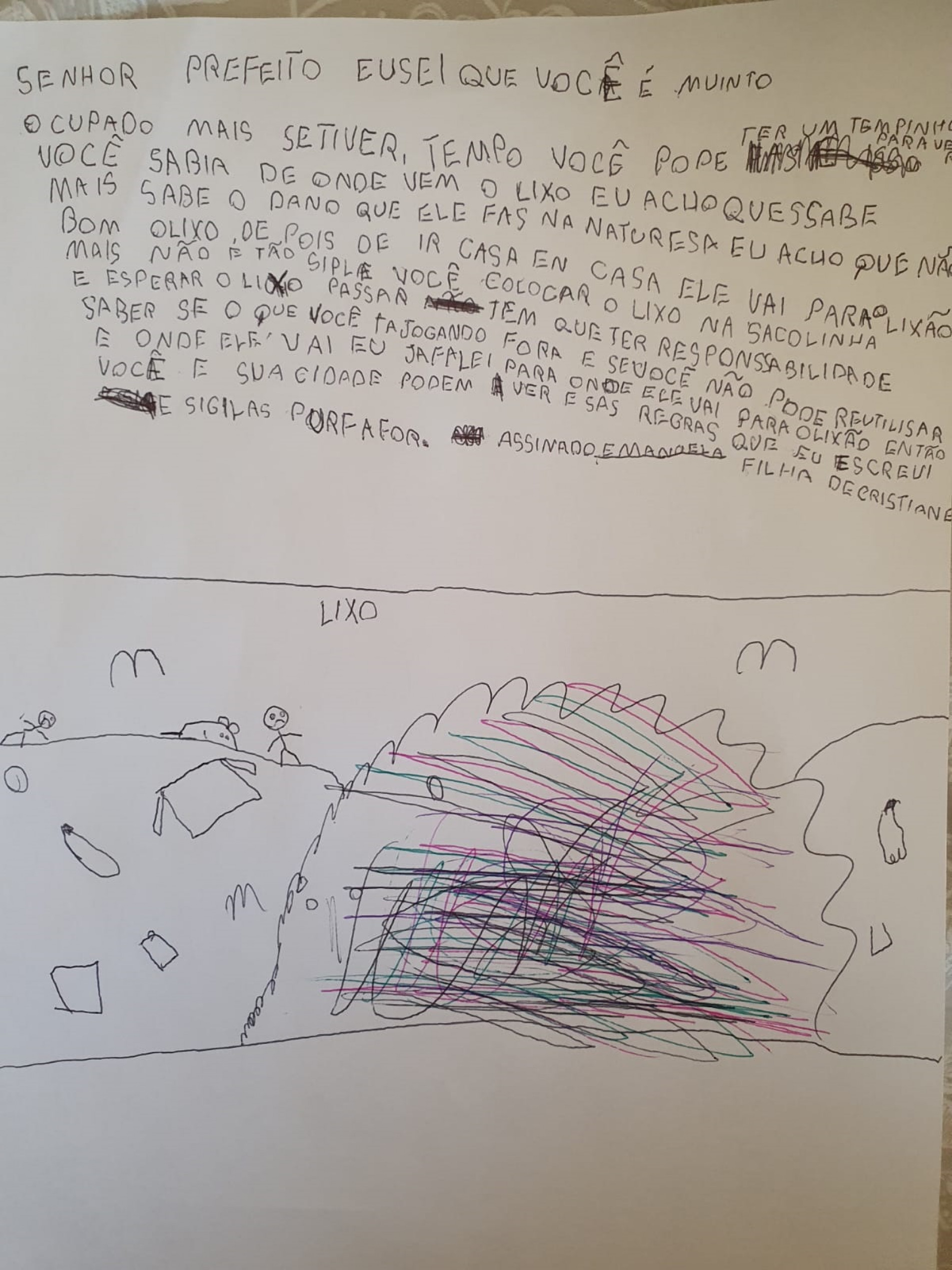 A Emanuela Campanholi já aprendeu tanto sobre a importância de se preservar o meio ambiente que decidiu escrever uma cartinha para o prefeito de Sorocaba, Rodrigo Manga. Nela, a estudante do 3º ano explica sobre os impactos do lixo no meio ambiente e esclarece sobre a correta destinação destes resíduos. A Manu ainda ilustra o problema dos lixões com um desenho, demonstrando que o não cumprimento das regras pode prejudicar a vida de todos. (Kally Momesso)