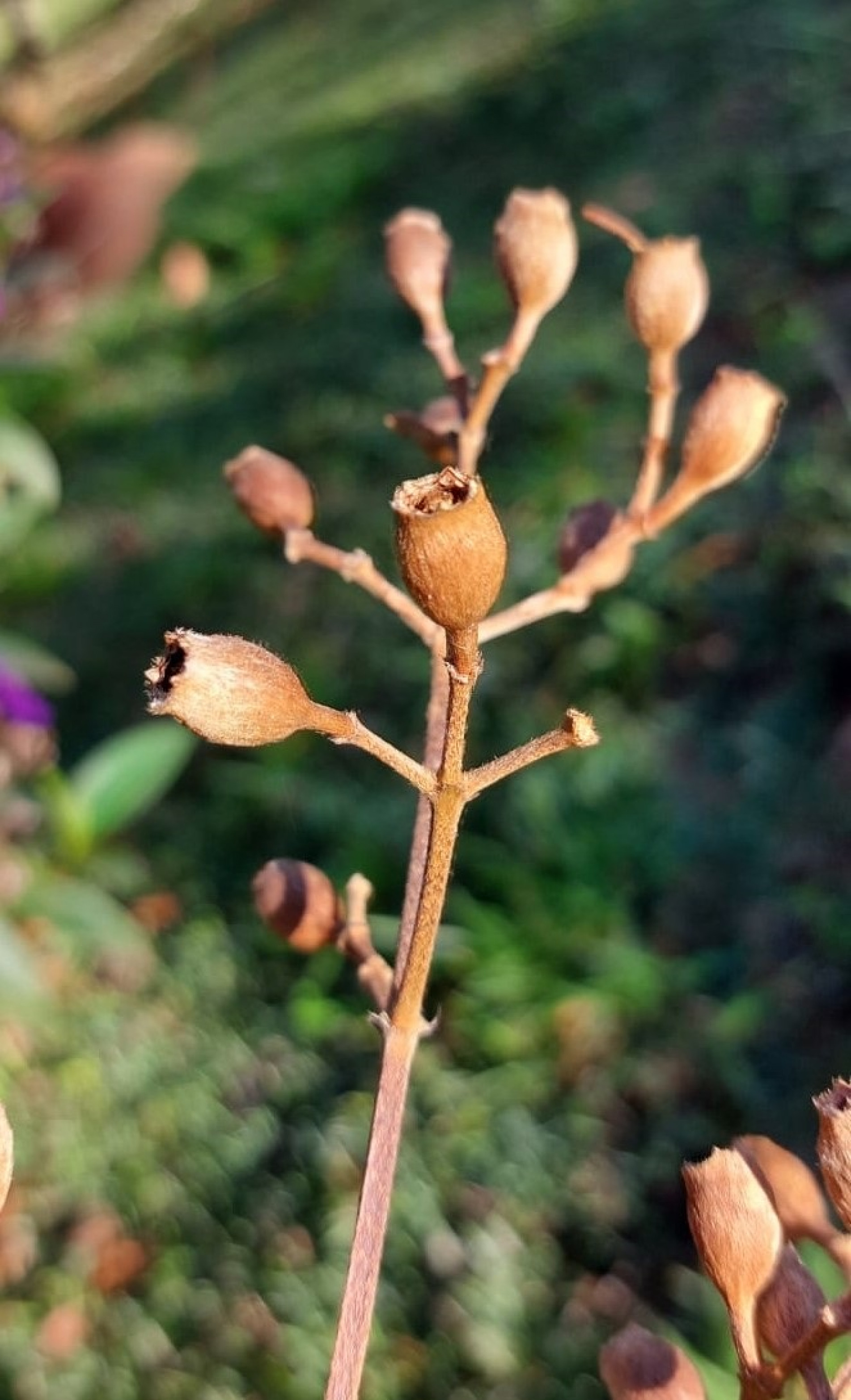 Já, os frutos da planta são pequeninos e parecem uma cápsula. Quando ele está maduro, ao sacudirmos, é possível observar que solta um pó muito fino, que é formado pelas as sementes, que são minúsculas e se dispersam com o vento.