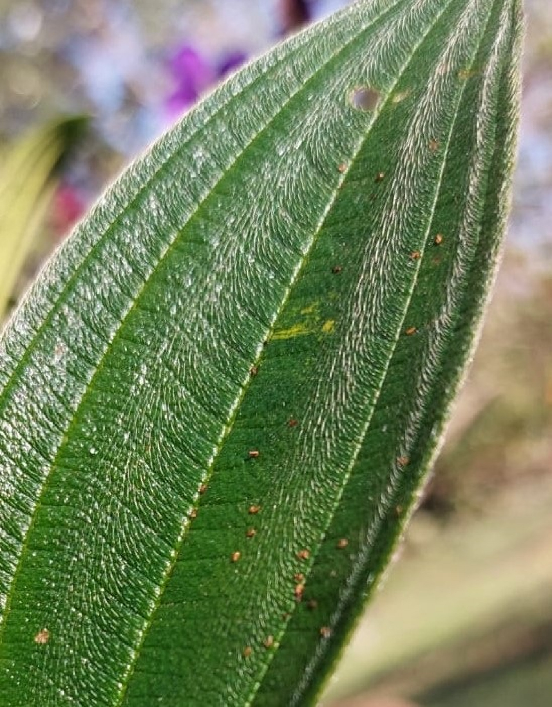 Identificar uma quaresmeira não é difícil. Ela possui folhas grossas, de cor verde escuro e com chamativas nervuras, que seguem paralelas umas às outras (veja na imagem). Além disso, as folhas possuem “pelinhos”, que dão uma textura bastante áspera quando as tocamos.