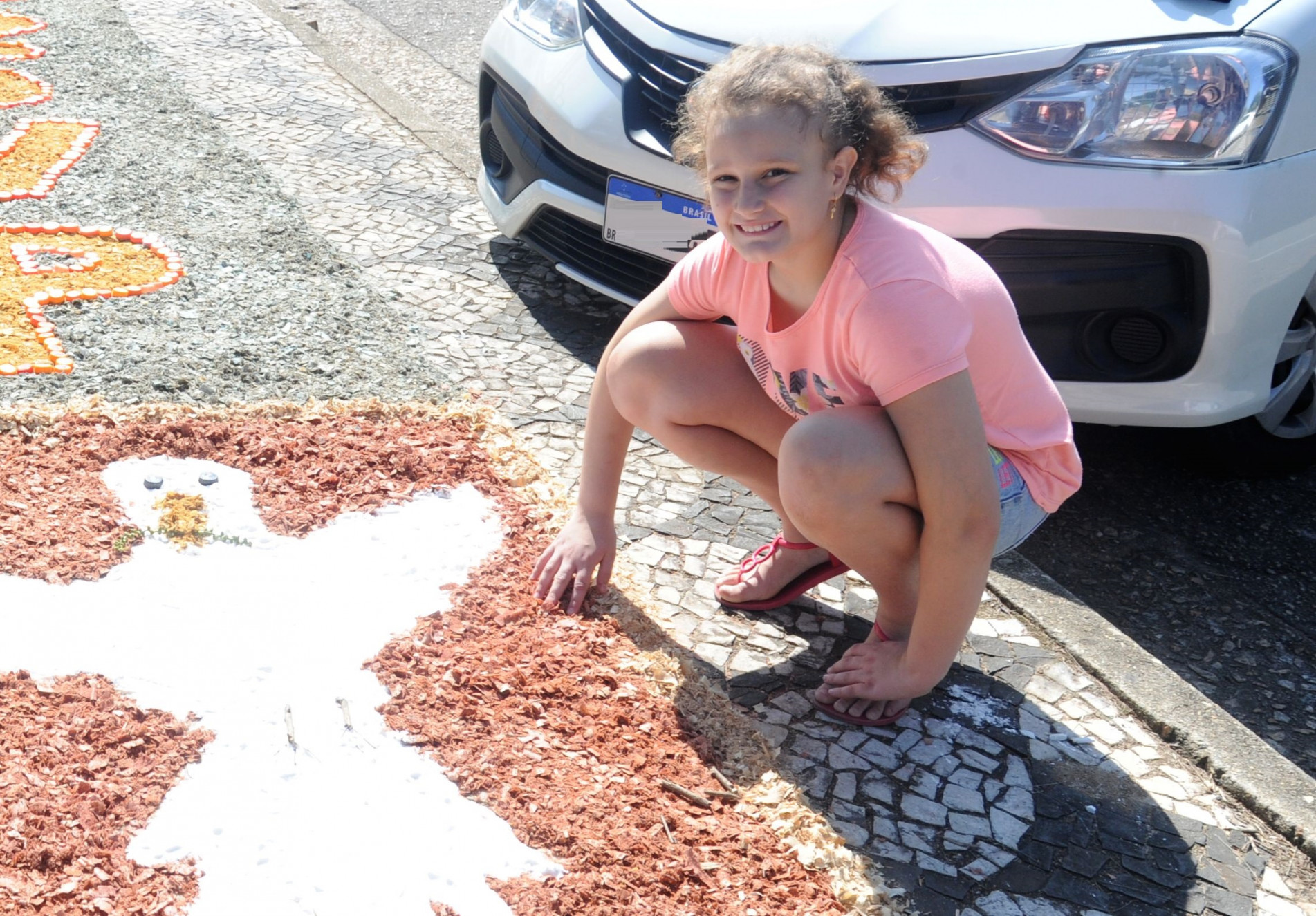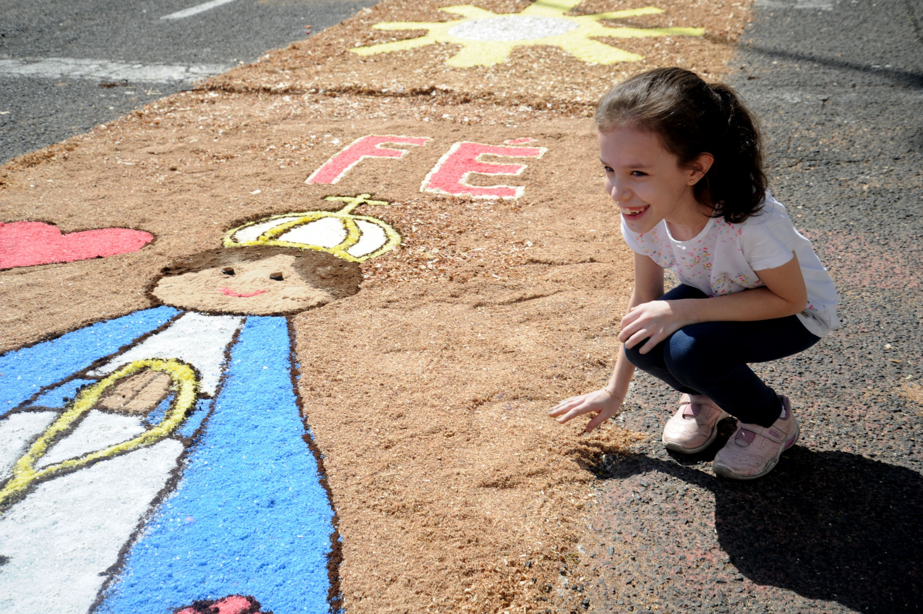 Isabela Quintiliano Formaggi, 9 anos, também ficou apreensiva enquanto enfeitava os arredores da paróquia Santa Rosália, localizada no bairro com o mesmo nome. Por ser a sua primeira vez envolvida no processo, ela acreditou, inicialmente, que não daria tempo de terminá-lo. Para a sua surpresa, uma força-tarefa, formada por cerca de 100 pessoas, concluiu o tapete medindo em torno de 500 metros. Das aproximadamente 40 imagens, Isabela contribuiu para a elaboração de seis. Quando viu tudo pronto, a sua tensão se transformou em satisfação. “Fiquei feliz, porque eu ajudei, e aliviada”, brincou, com um sorriso no rosto. (Vinicius Camargo)