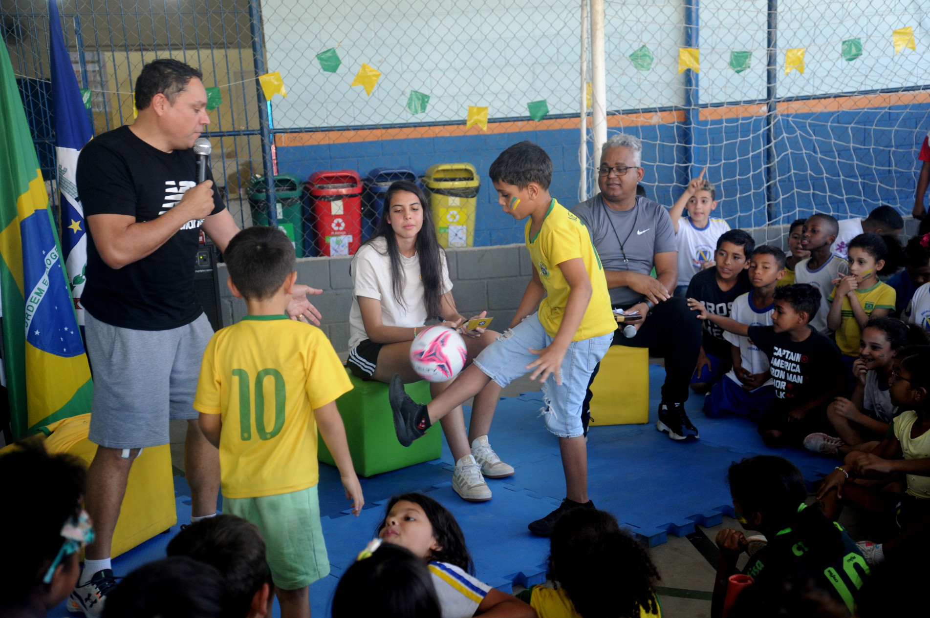 Além de responder as dúvidas da criançada, óbvio que a jogadora não poderia deixar de propor um desafio. Alguns estudantes foram escolhidos para uma disputa de embaixadinhas e teve gente que mandou bem, viu! A defensora até ensinou algumas técnicas. O pessoal amou!