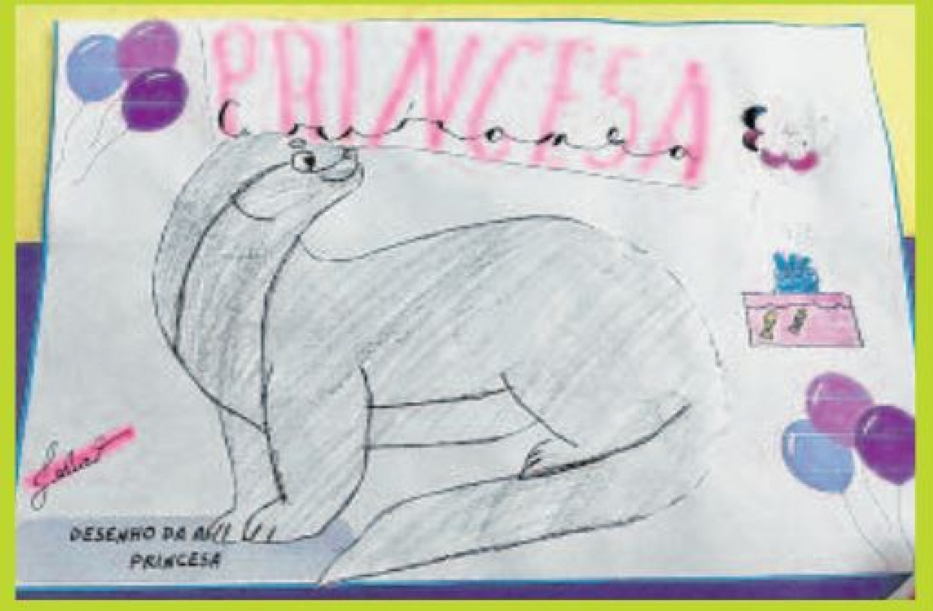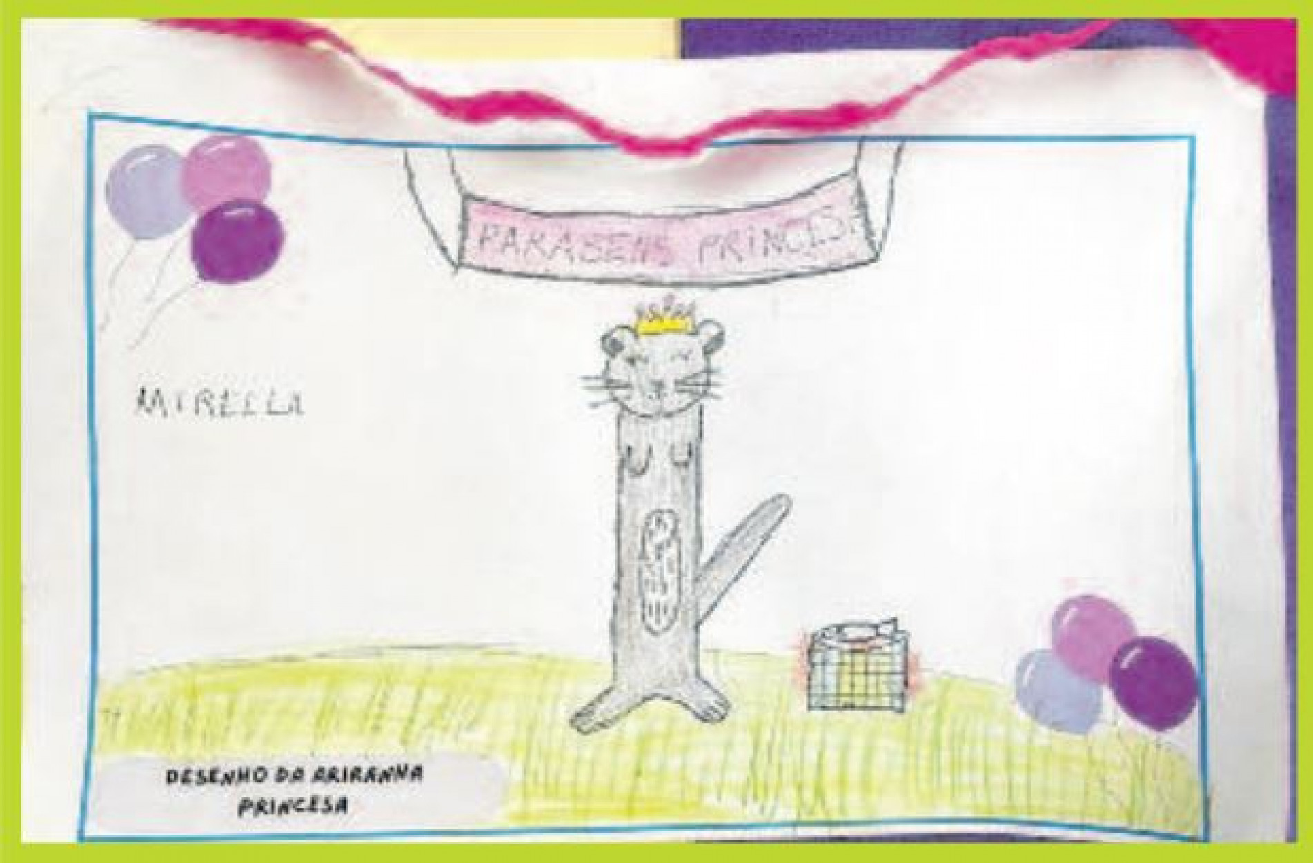 Antes de falarmos mais sobre os desenhos, vejam só que fofo o recadinho que eles mandaram: “Nós lemos o cruzeirinho e adoramos as notícias, principalmente a da ariranha. A gente aprendeu que as ariranhas estão em risco de extinção, e que a Princesa é a ariranha mais velha do Brasil. Ficamos muito felizes da Princesa ter ganhado uma festa de aniversário, mas tristes de não participar para dar parabéns para ela. Obrigada por compartilharem essas informações com a gente!.”
