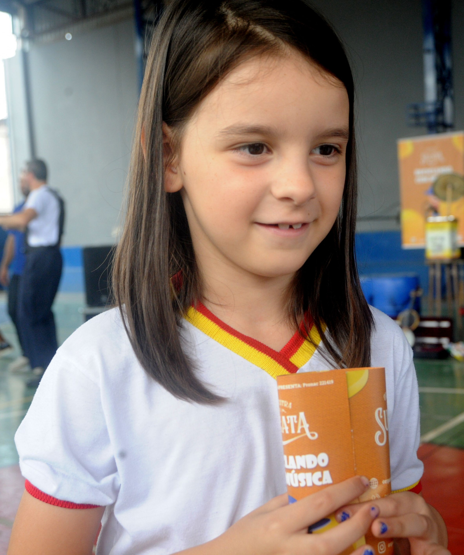 Em meio a uma explicação e outra, muita música rolou. Não teve quem não balançou o corpinho em vários momentos, viu? Animação total; afinal, foram ao menos 10 composições. Uau! A Maria Eduarda Peres da Silva, de sete anos, foi uma das que não parava quieta de tão feliz que ficou com a apresentação. “Foi muito ‘da hora’, gostei muito do guitarrista. Ele corria por todo espaço, dançou, amei”, contou a estudante, ainda eufórica ao final da atividade. “Nunca tinha visto algo assim e achei bem legal. Em casa meu irmão, de 12 anos, usa algumas coisas pra fazer um som e é bem divertido”, complementou a aluna do 1º ano B.