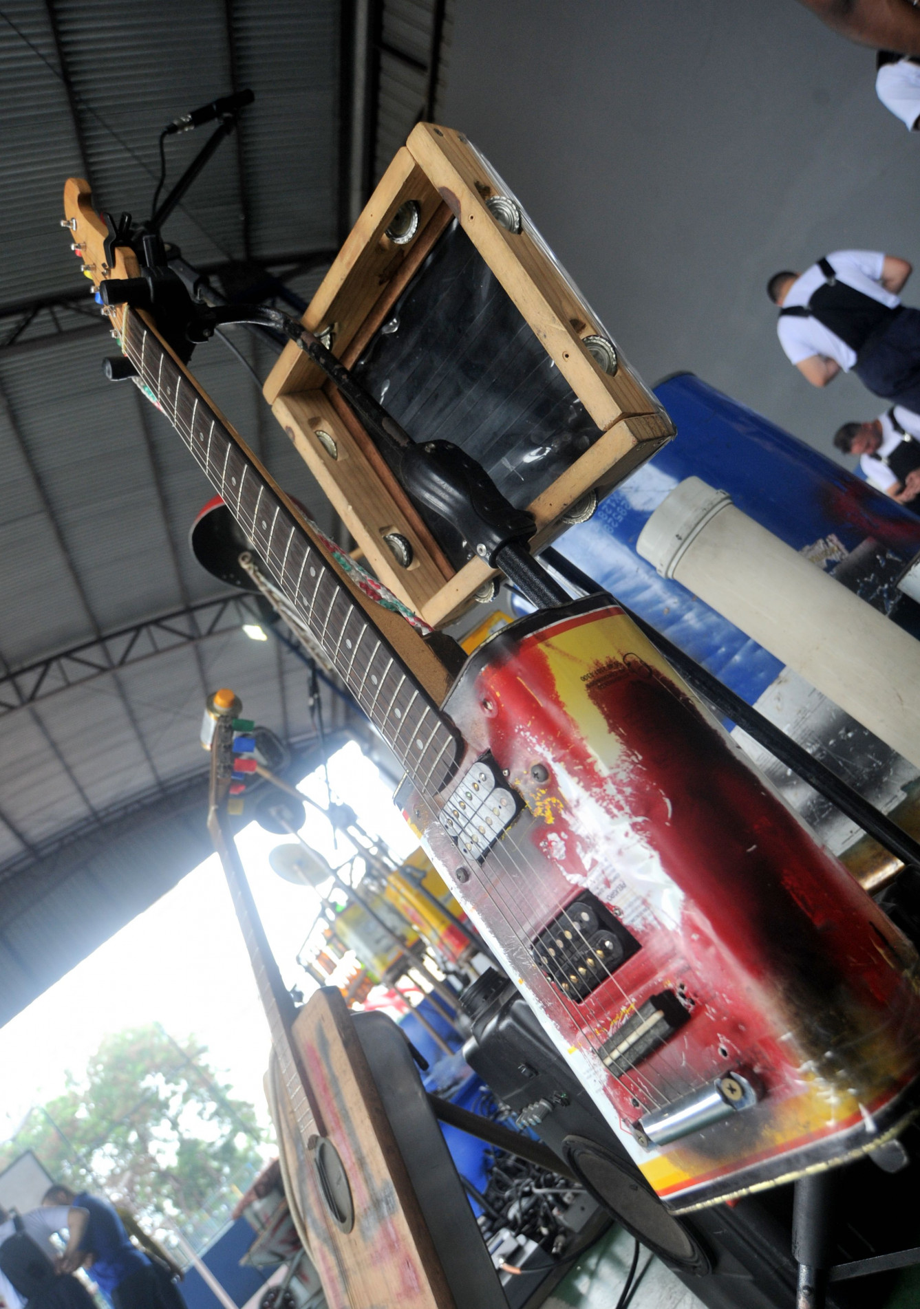 Pois então sejam apresentados ao panelino (primo do violino feito com algumas partes das panelas) e ao guitatão (uma guitarra com base de latão). Outros equipamentos que não ganharam um nome especial, mas que também foram criados por eles, são o piano de garrafas de vidro, o baixo (feito com um pedaço do instrumento original e um carrinho de mão -- sim, aqueles usados na construção civil), a flauta (com um tubo e tampinhas de garrafa), além do fundo de panelas que fizeram a vez dos pratos de uma bateria e baldes. Lembrando que todos os itens seriam descartados no lixo e, através da iniciativa, ganharam uma sobrevida.