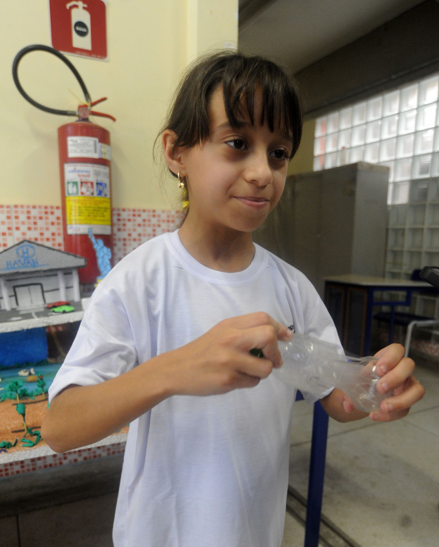 A Lorena de Oliveira Lima, de nove anos, já tem a consciência ambiental de gente grande. Ela disse que gostou muito de ter a consciência que algo destinado a ir para o lixo pode ser reaproveitado como instrumento musical ao ser juntado a outros itens. A pequena apostou em um objeto que não tem um nome específico, mas que foi produzido com uma garrafinha pet pequena com cortes na lateral que, ao raspar, emite um som interessante. “Adoro música e na oficina aprendi a guardar as coisas e reutilizar. Não sabia da importância e vou levar os ensinamentos pra casa. Mas eu já guardo as folhas e uso os espaços que sobra pra desenhar. É bem importante cuidar do meio ambiente, né?”, disse a estudante do 4º ano. (Thaís Marcolino)